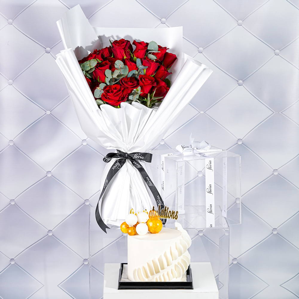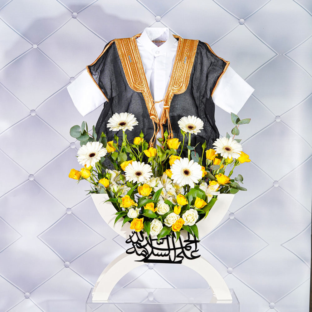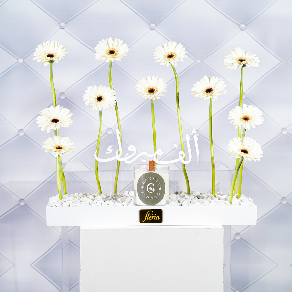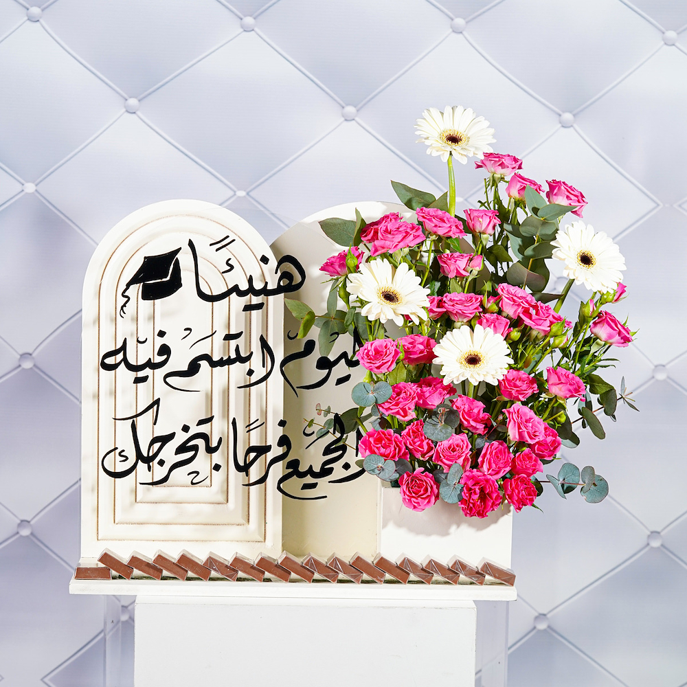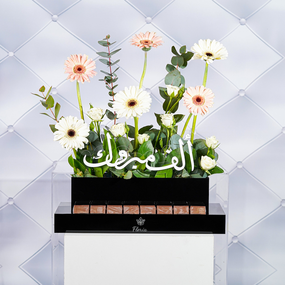 Beautiful stand with luxurious flowers of roses and gerbera with an acrylic stick and bisht.