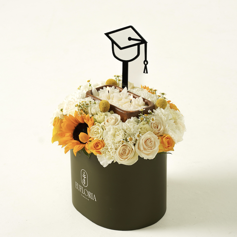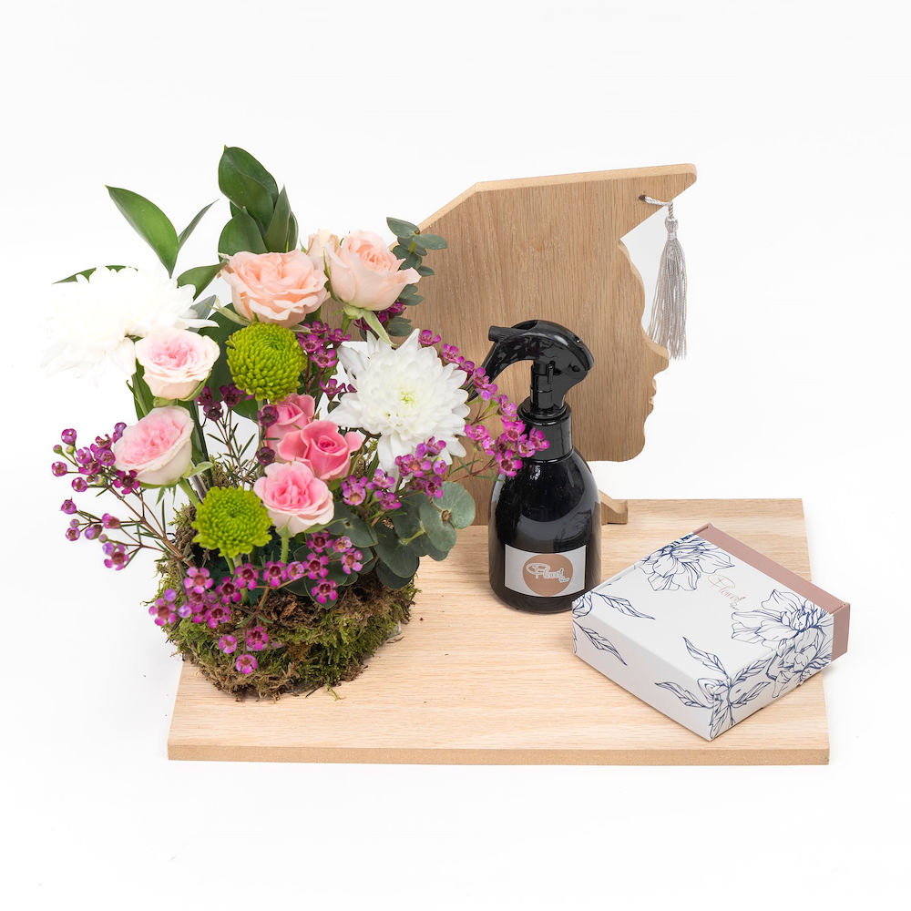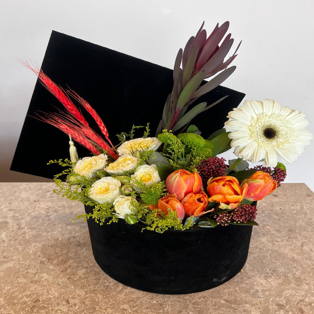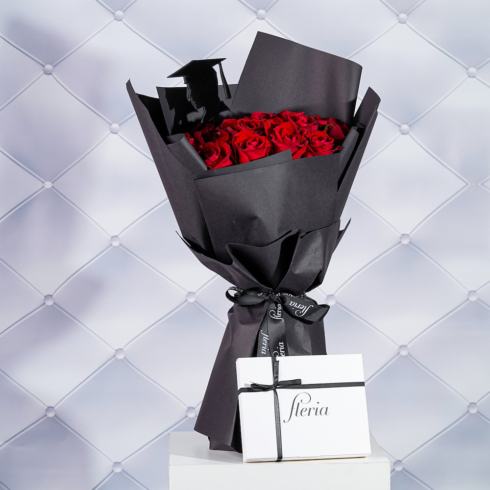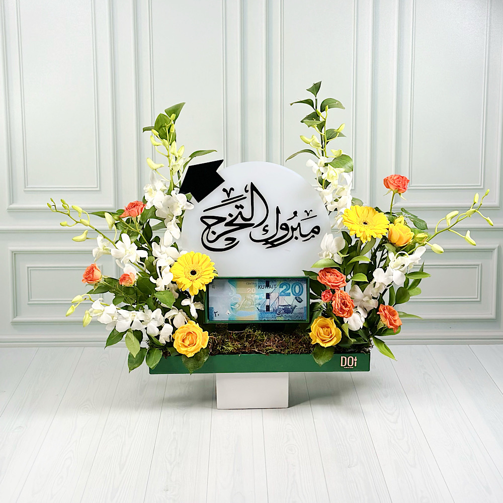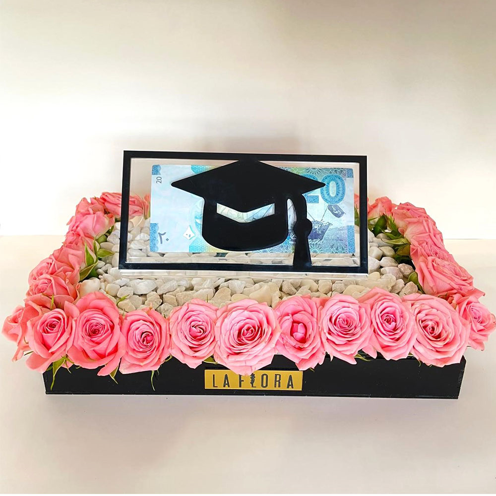 Beautiful stand with luxurious flowers of roses and gerbera with an acrylic stick and bisht.