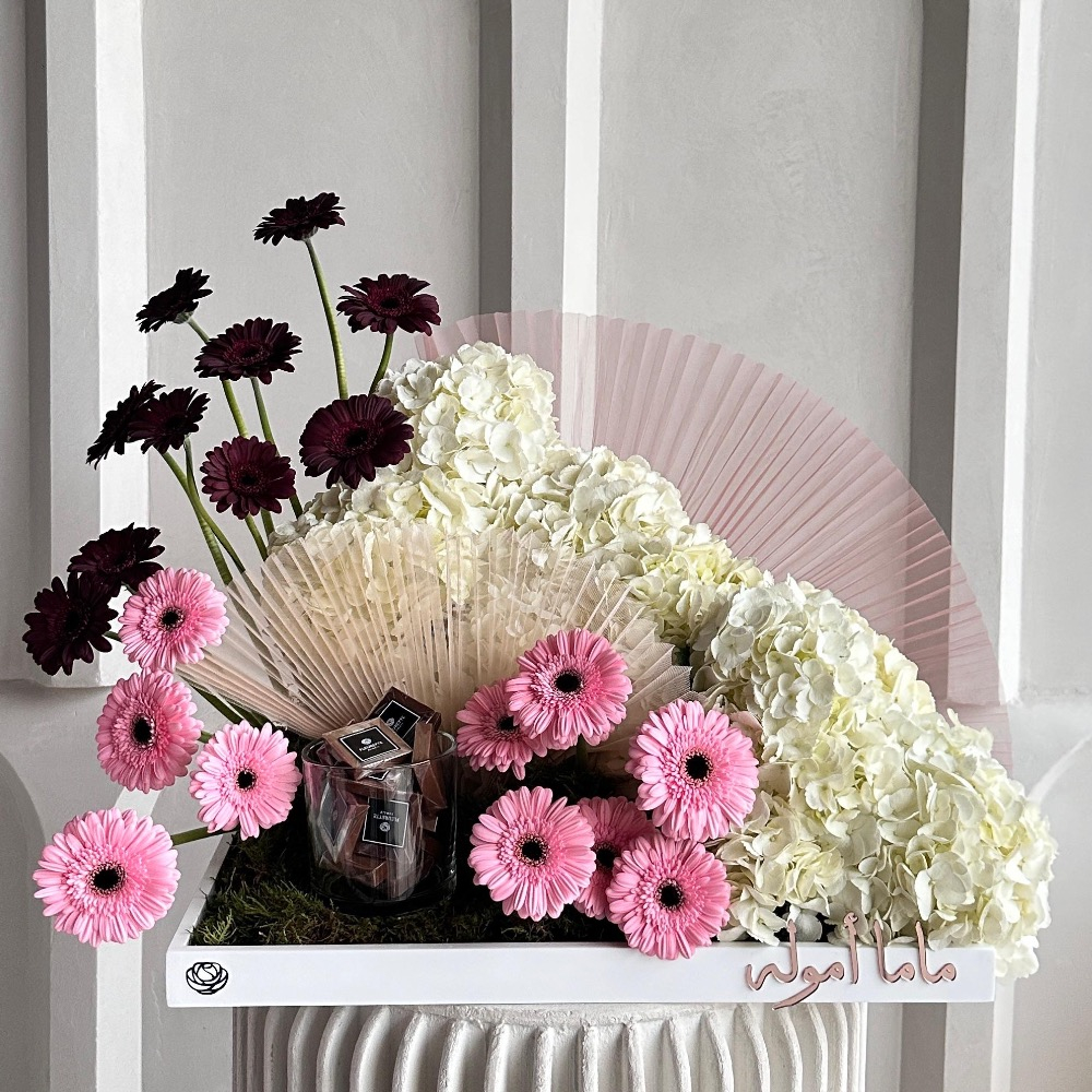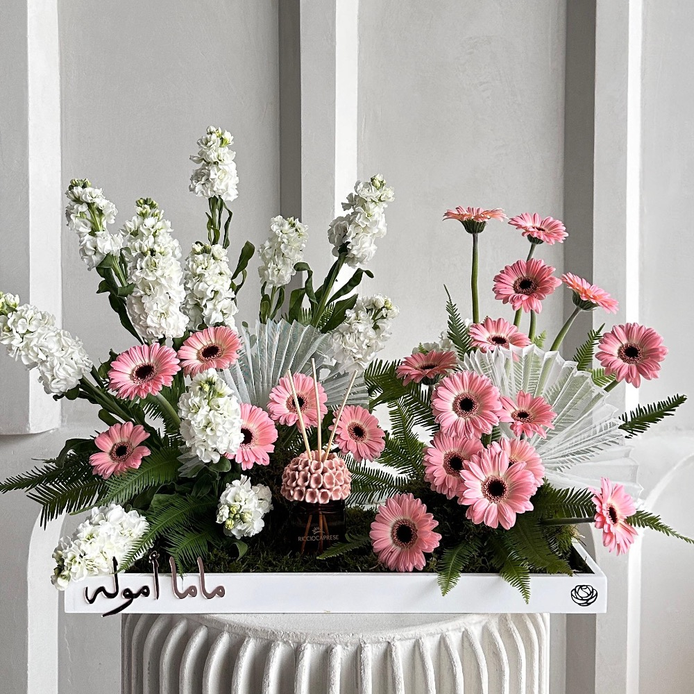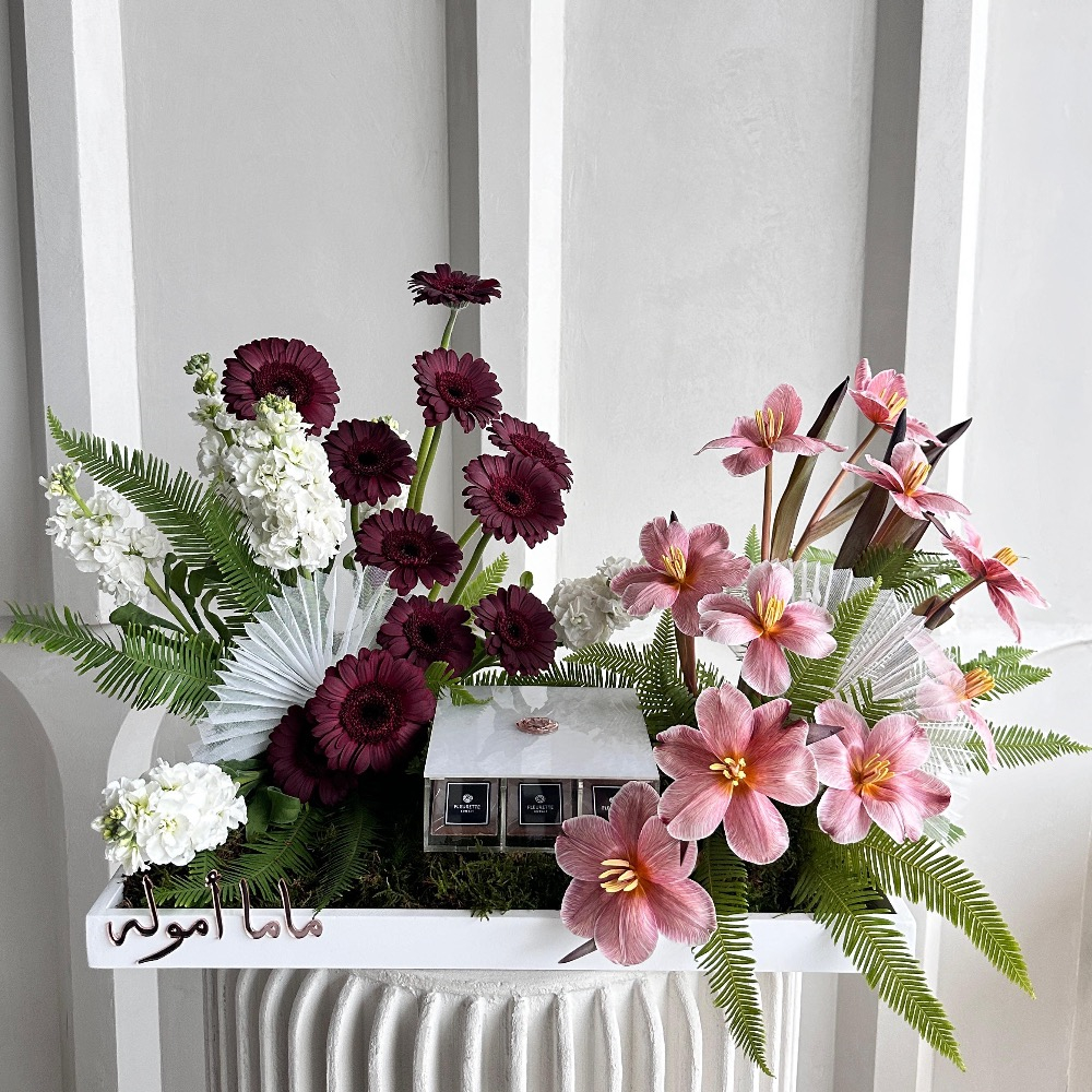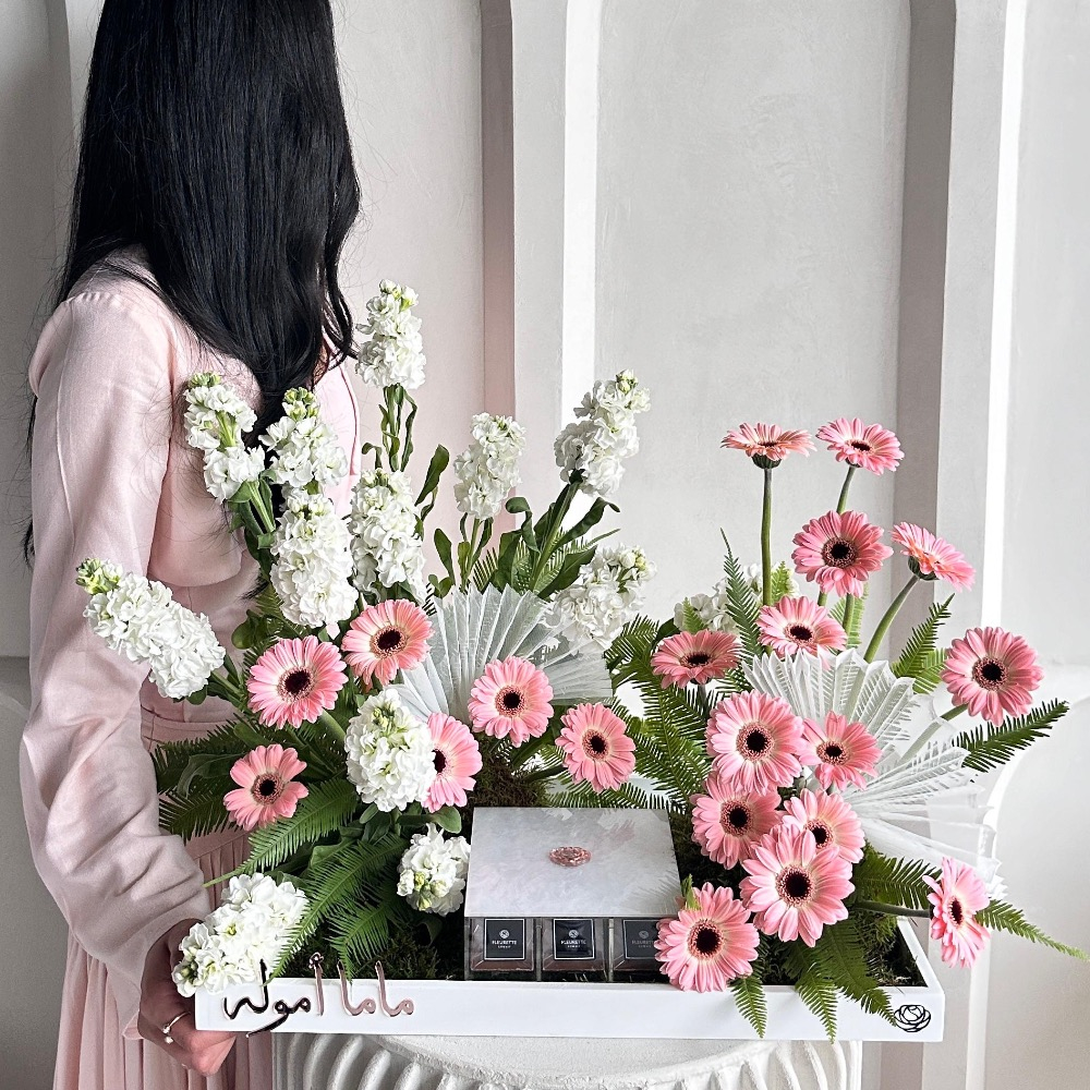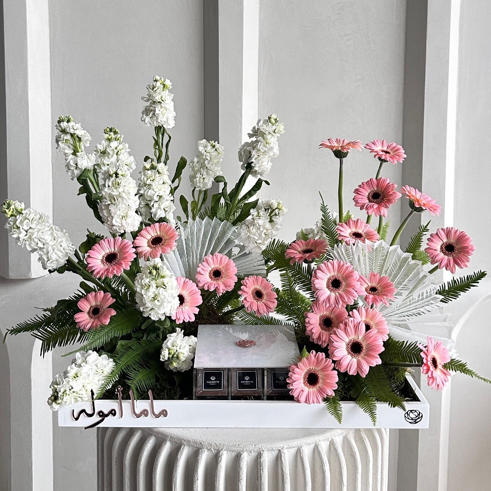 A tray filled with gerbera and mathiola flowers with a marble chocolate box and customized name.