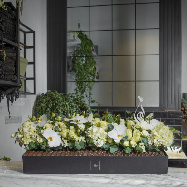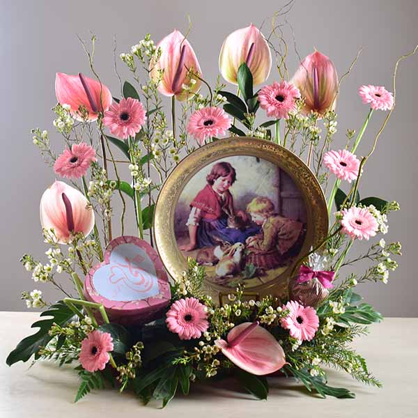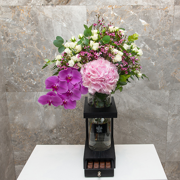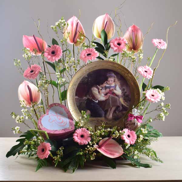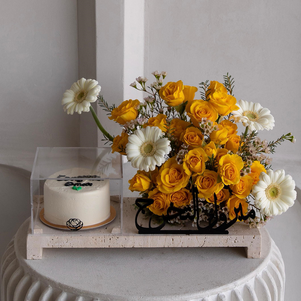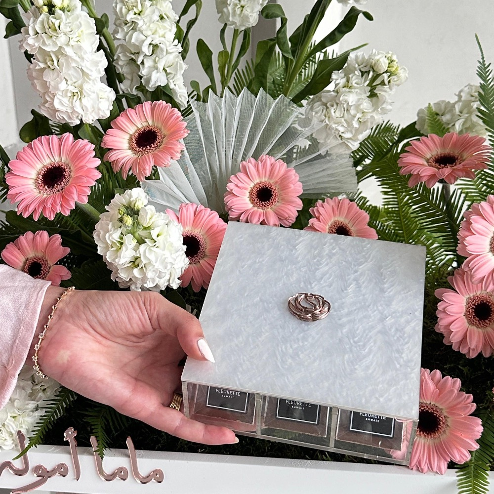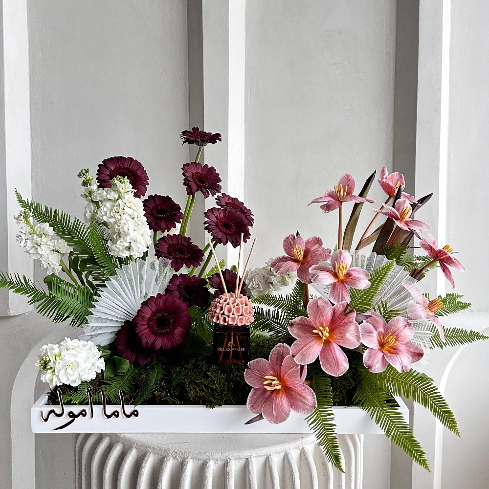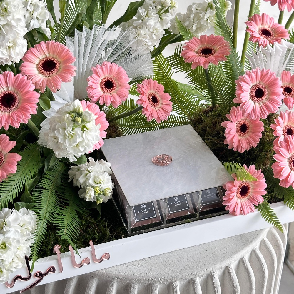 A tray filled with gerbera and mathiola flowers with a marble chocolate box and customized name.