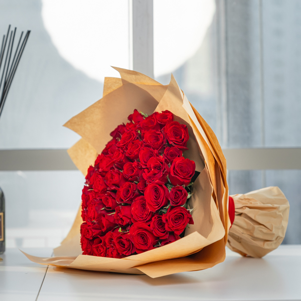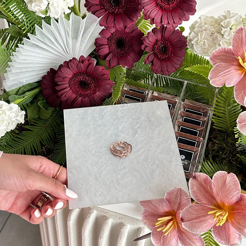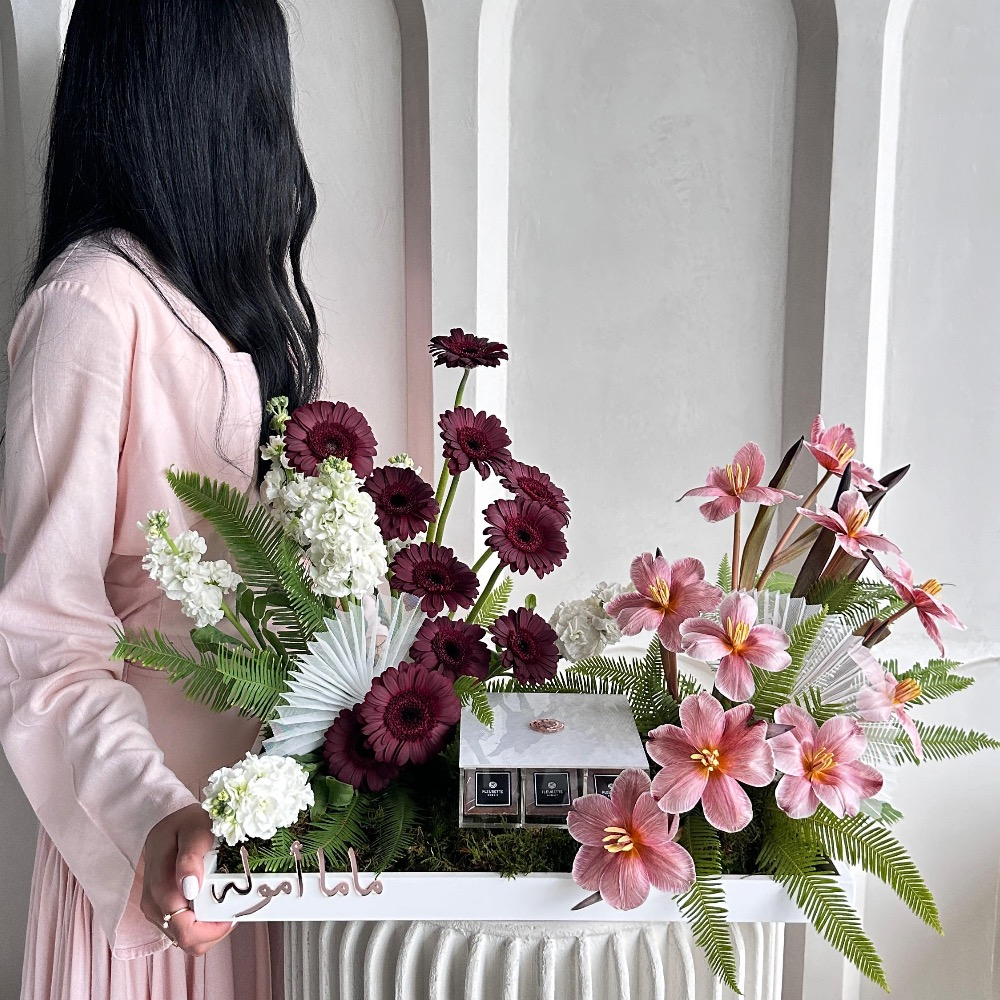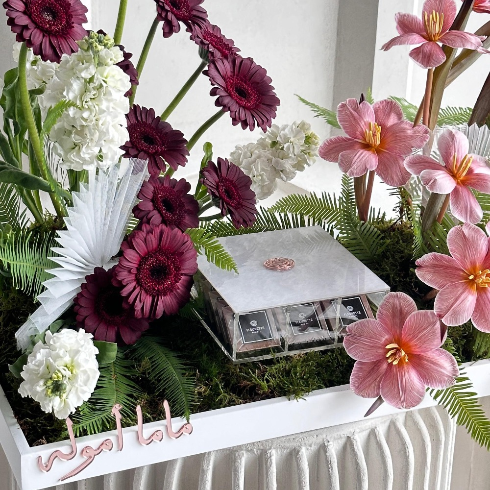 A tray filled with gerbera and tulip flowers with a marble chocolate box and customized name.