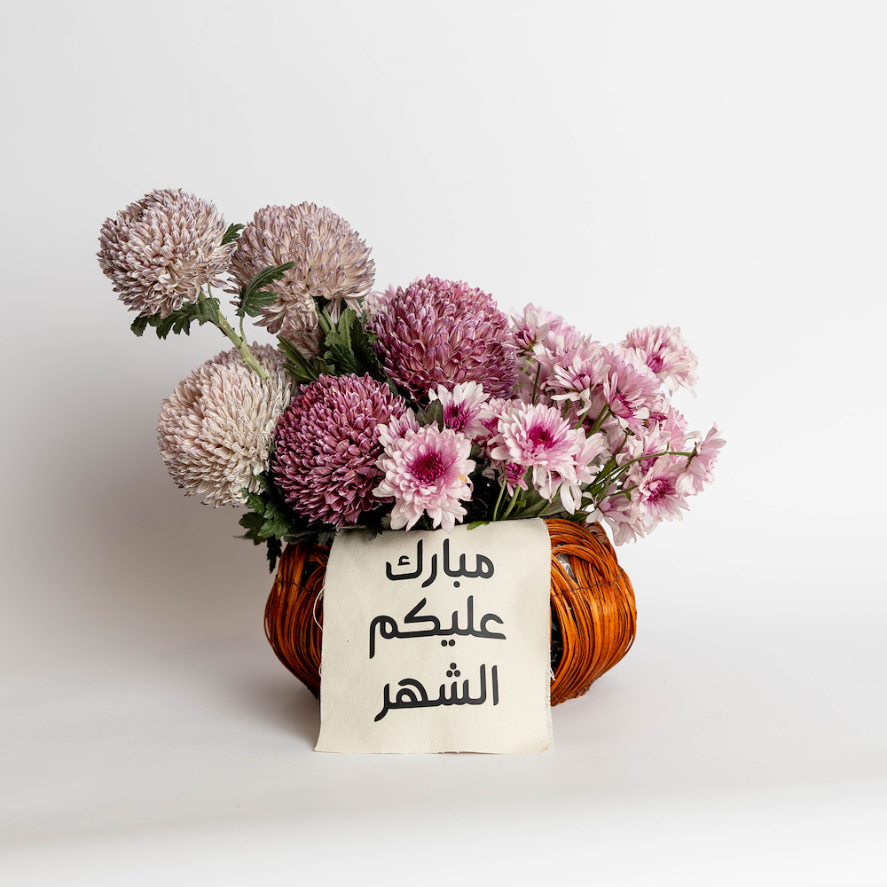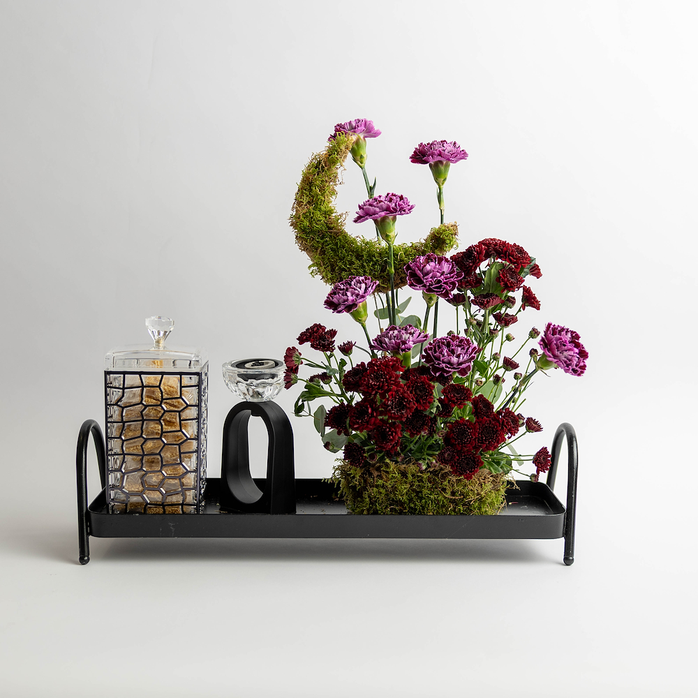 A contemporary box featuring striking purple alliums, anthuriums and lush green moss with an empty money pocket. Note: money is not included.