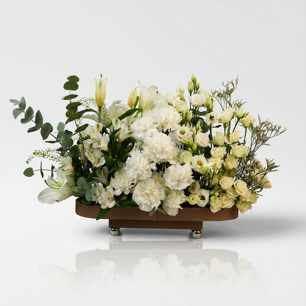A tray that contains roses, tulips, carnations and wax flowers.
