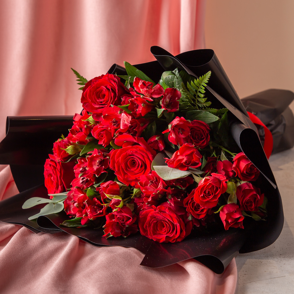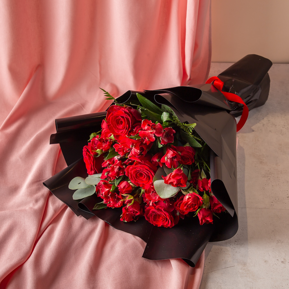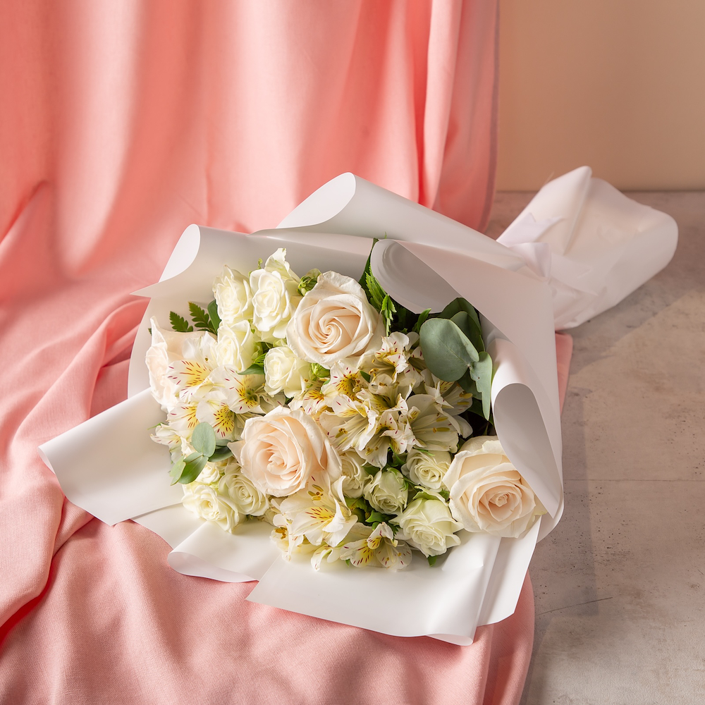 This hand bouquet contains roses, spray roses and alstroemeria.