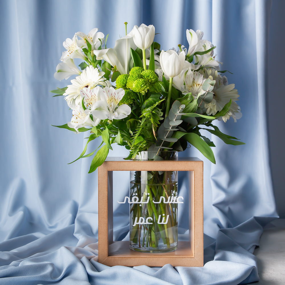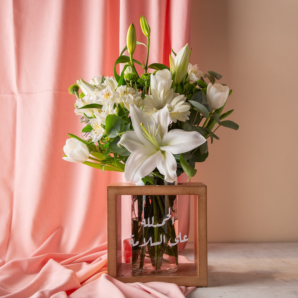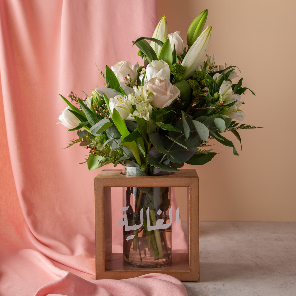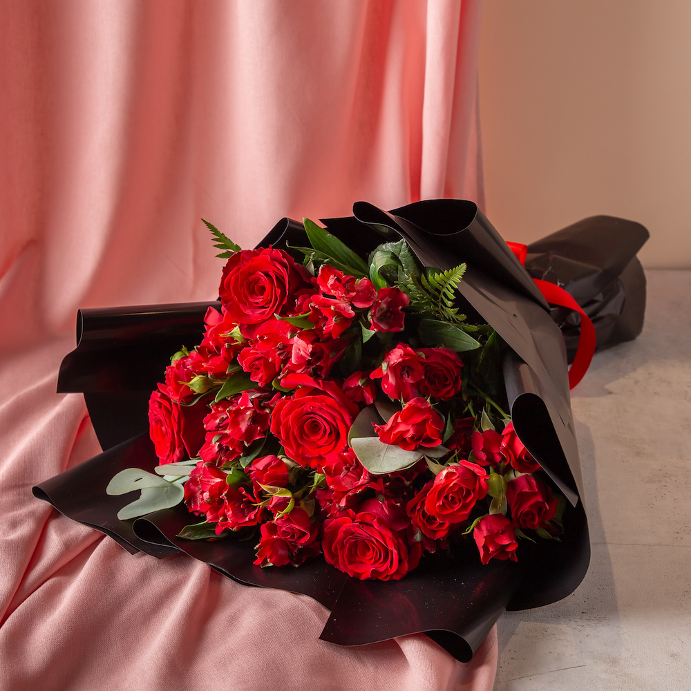 This hand bouquet contains roses, spray roses and alstroemeria.