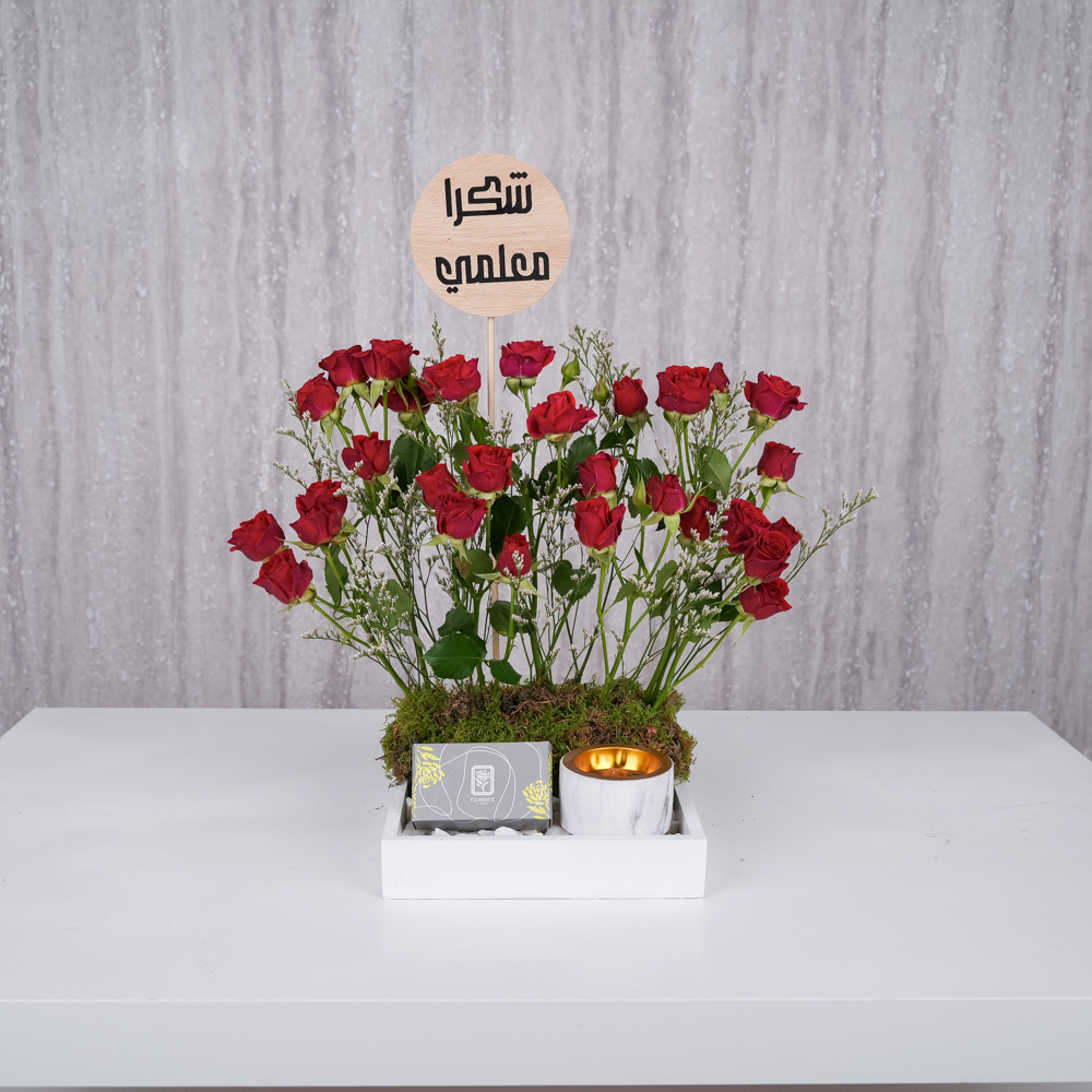 This bouquet contains baby roses with chocolates and a mubkhar.
