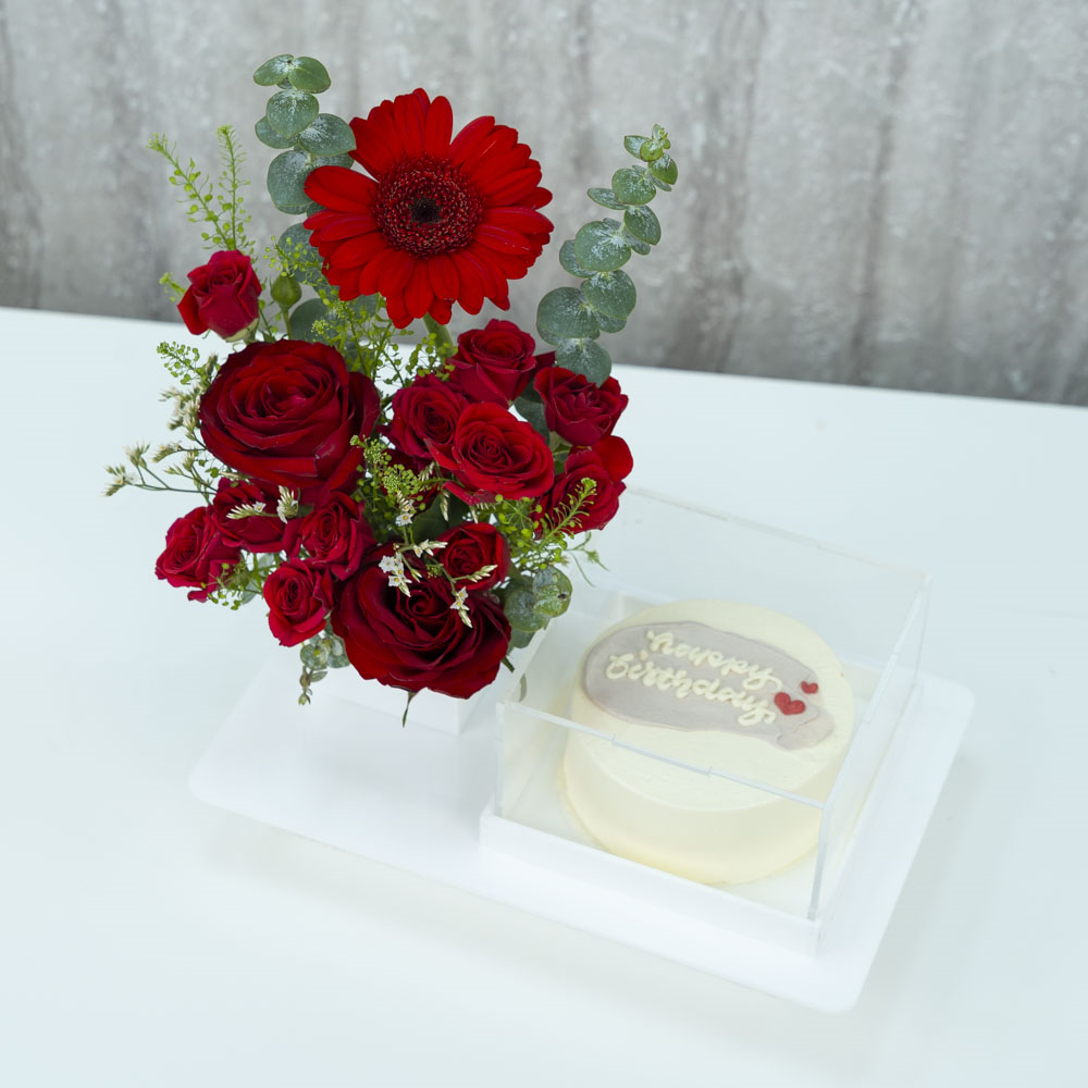 A bouquet that contains roses, baby roses and gerberas along with a bento cake.