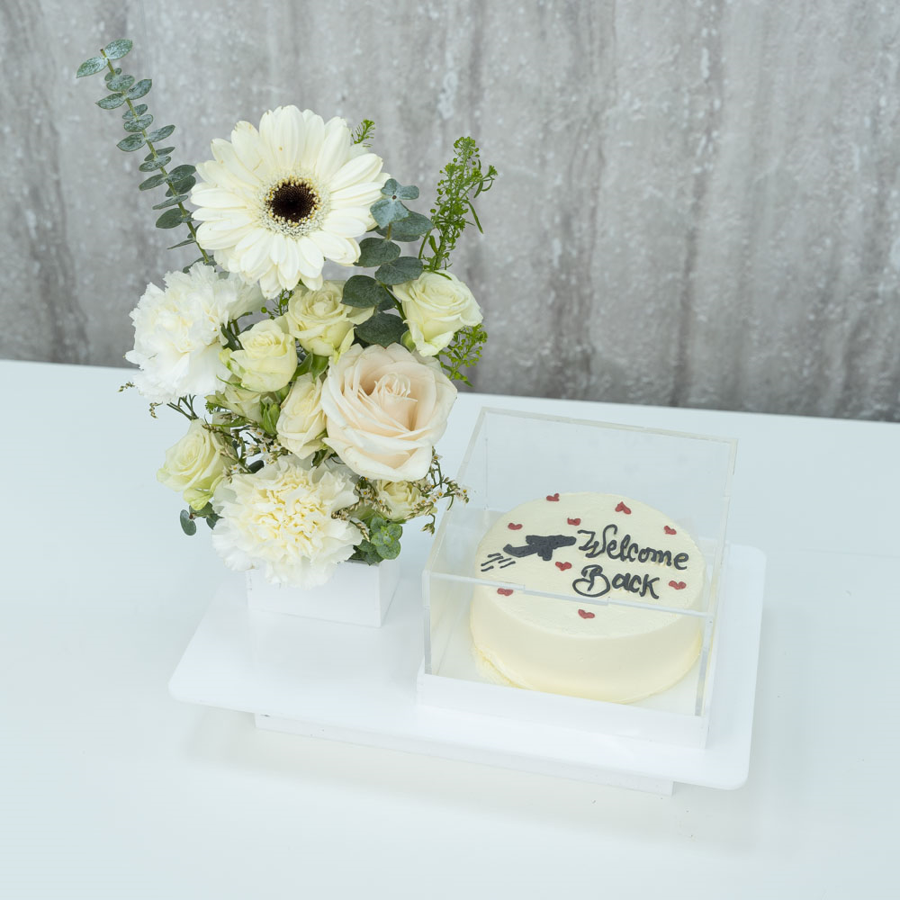 This bouquet contains roses, gerberas, carnations, and baby roses with a chocolate bento cake.