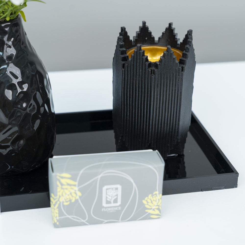 This bouquet contains chrysanthemums with chocolates and an incense burner.
