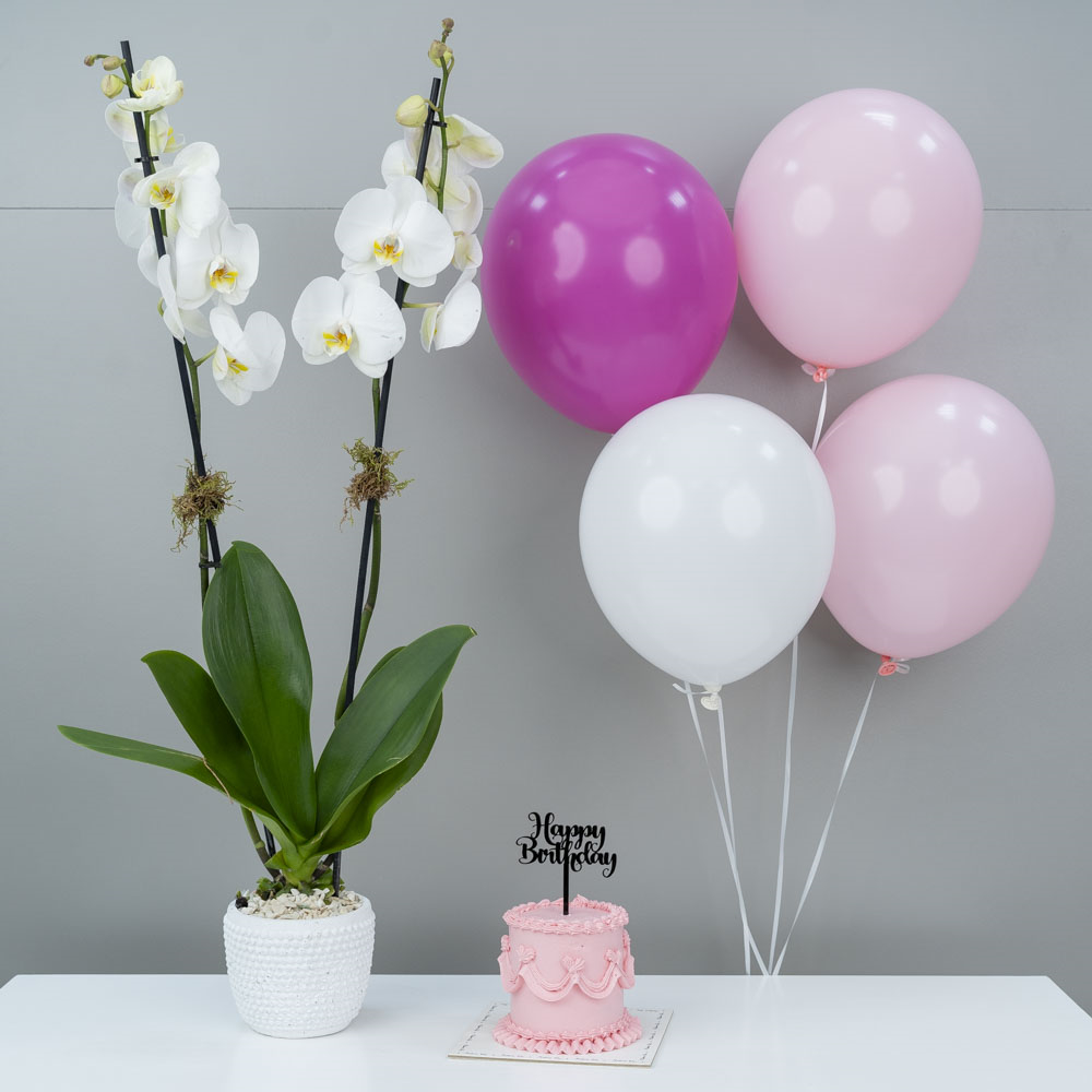 This bouquet contains orchid plants with a chocolate cake and 4 helium balloons.