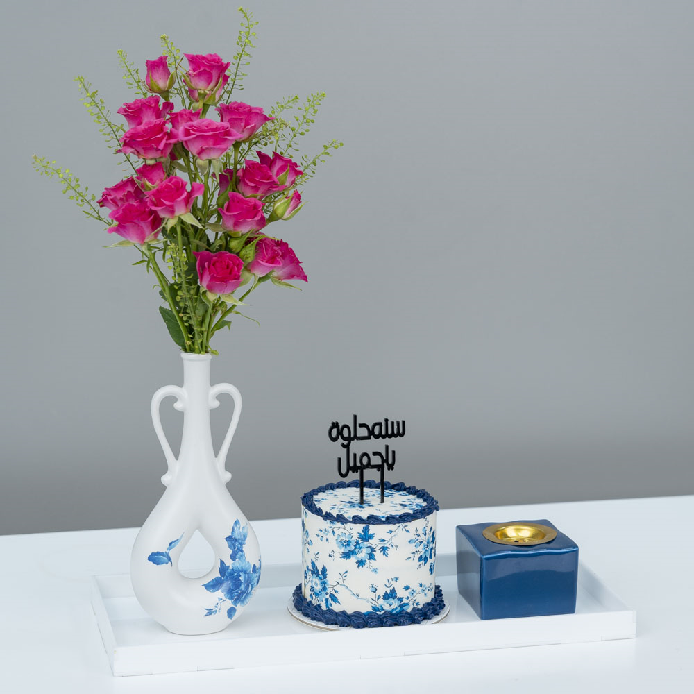 This bouquet contains baby roses with a chocolate cake and an incense burner.