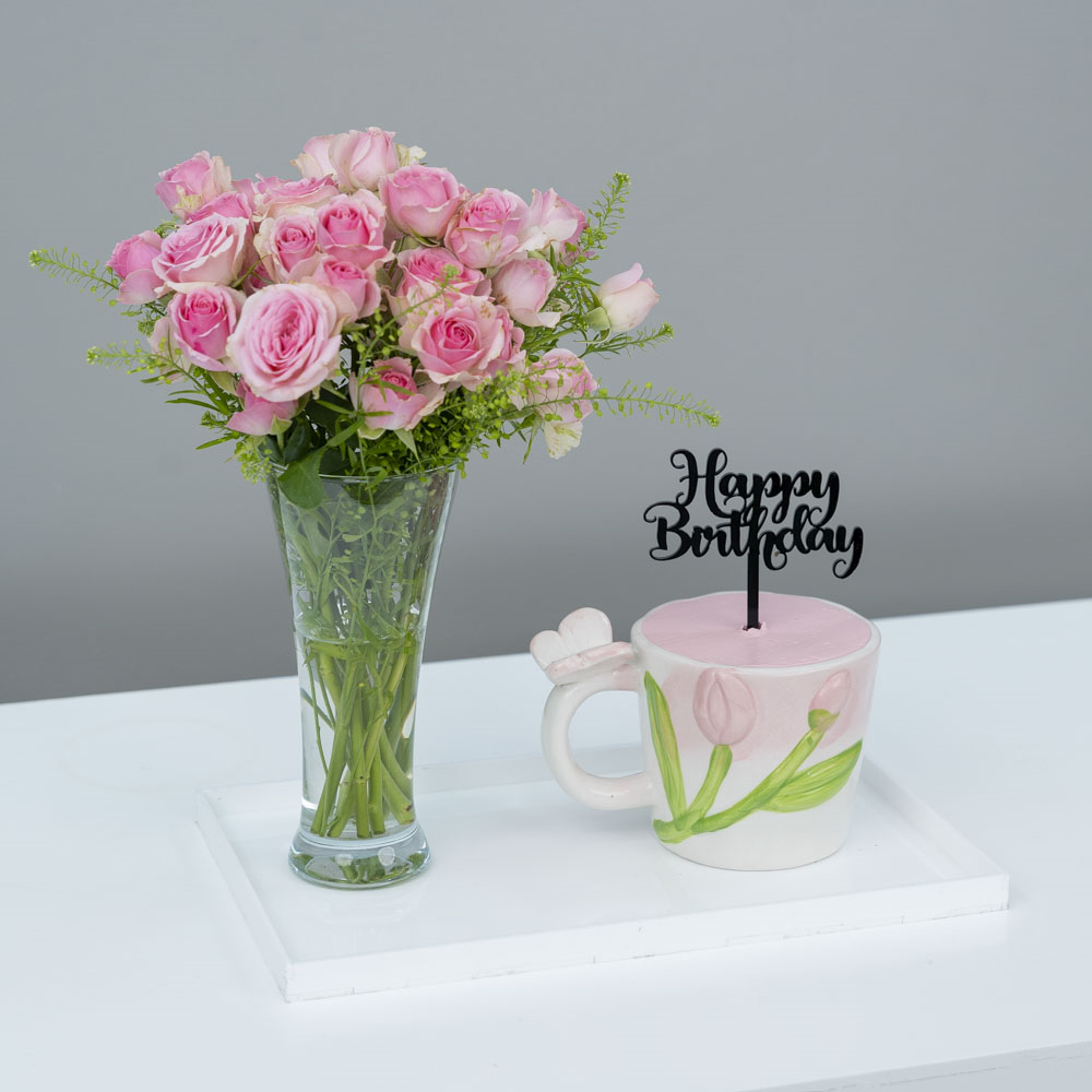 This bouquet contains baby roses with a ceramic mug that contains a chocolate cake.
