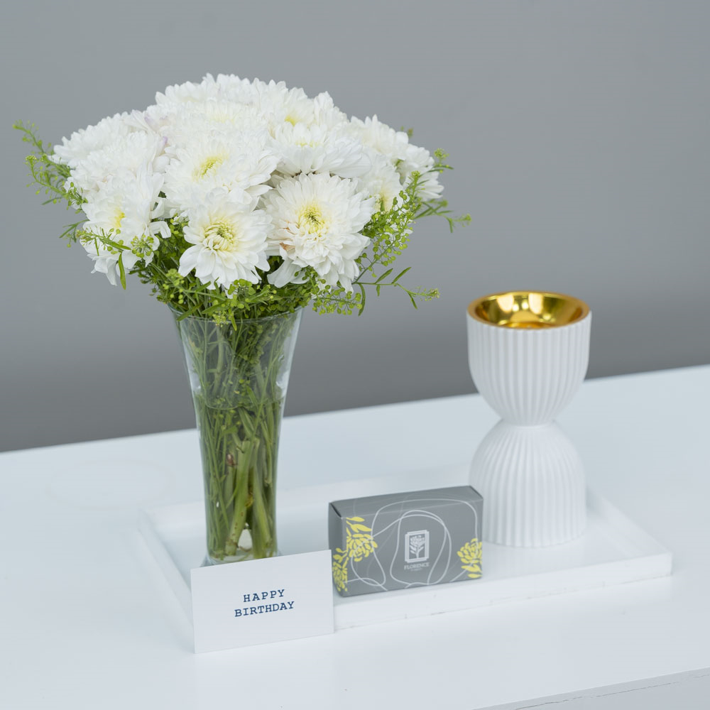This bouquet contains chrysanthemums with chocolates and an incense burner.