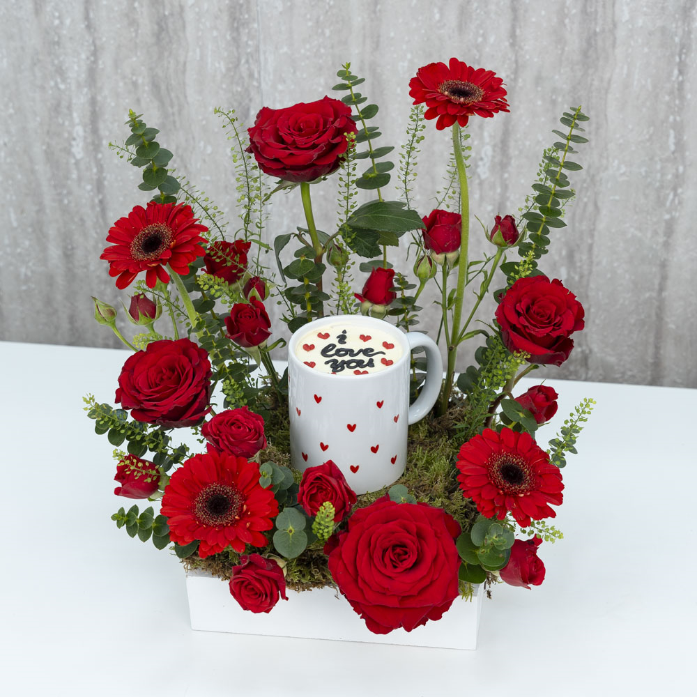 This bouquet contains roses and baby roses with a chocolate cake in a mini cup.
