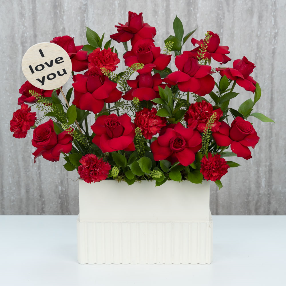 This bouquet contains carnations and roses.