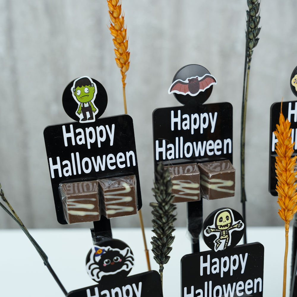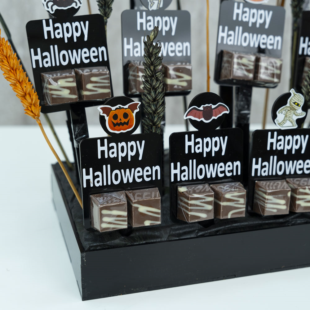 An acrylic tray decorated with colored wheat with 12 Belgian chocolate giveaways.