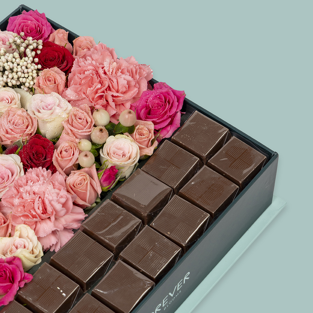 A luxurious gift box combining premium roses and delicate seasonal carnations with 16 handcrafted chocolate cubes. Soft pink, ivory, and red tones create a romantic and elegant look, making it ideal for birthdays, anniversaries, congratulations, or heartfelt gifting. Beautifully arranged and presented in our signature Florever tray.
