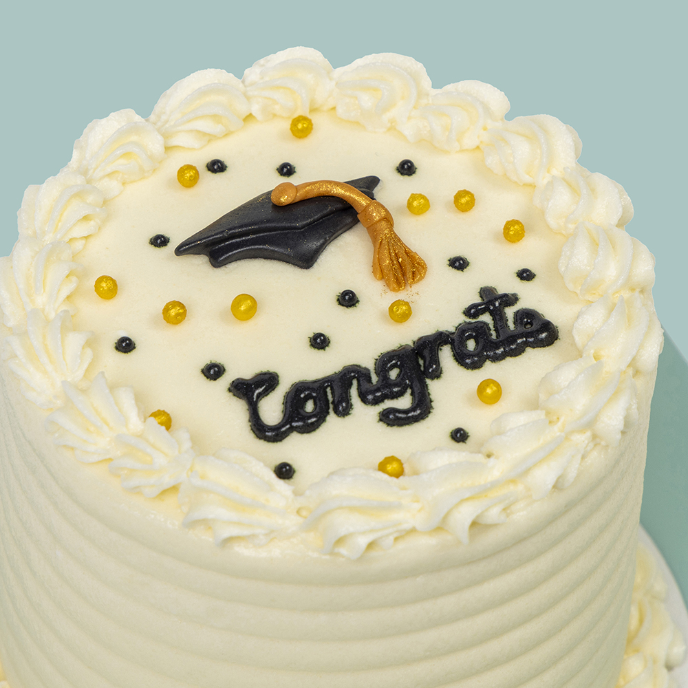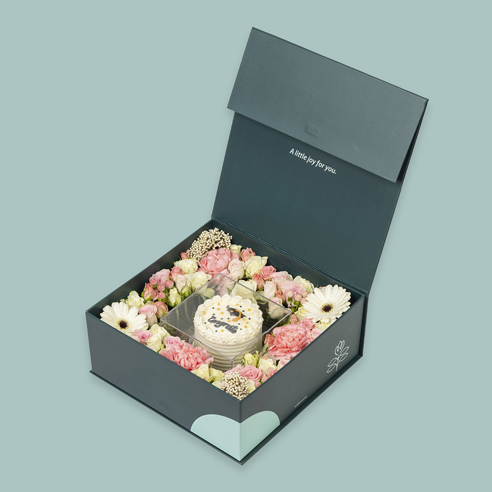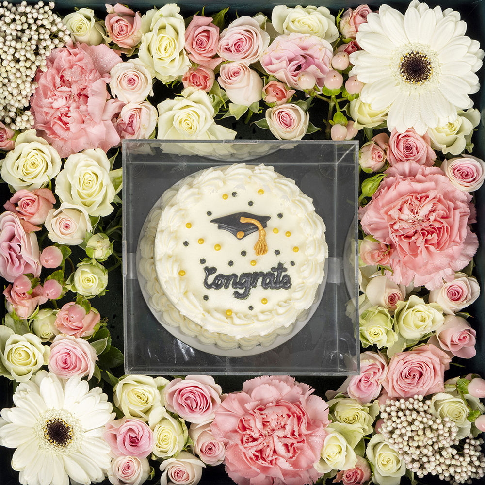 A box that contains roses, baby roses, gerberas and carnations along with a cake.