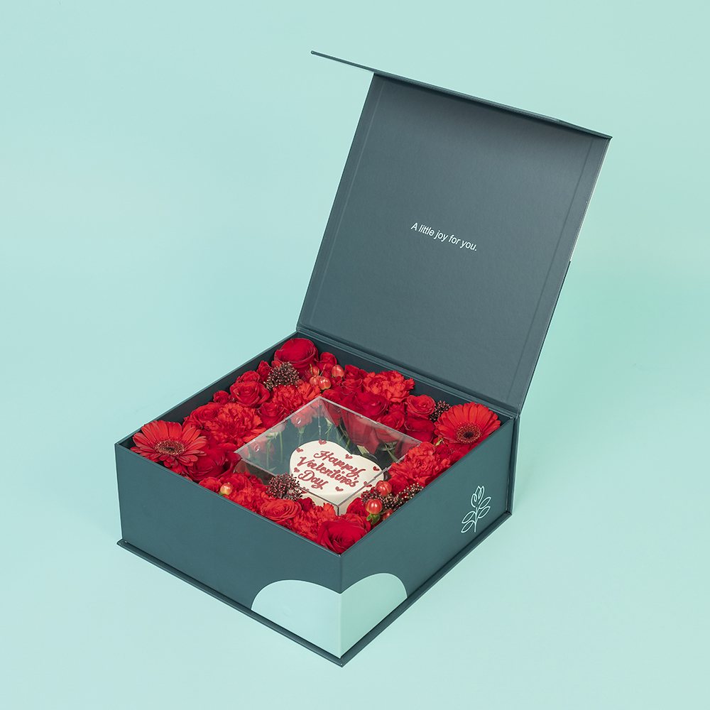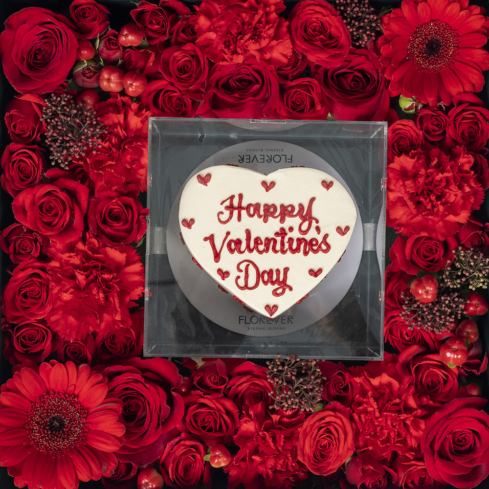An elegant box filled with roses, baby roses and gerbera flowers with a mini cake with English customization only.