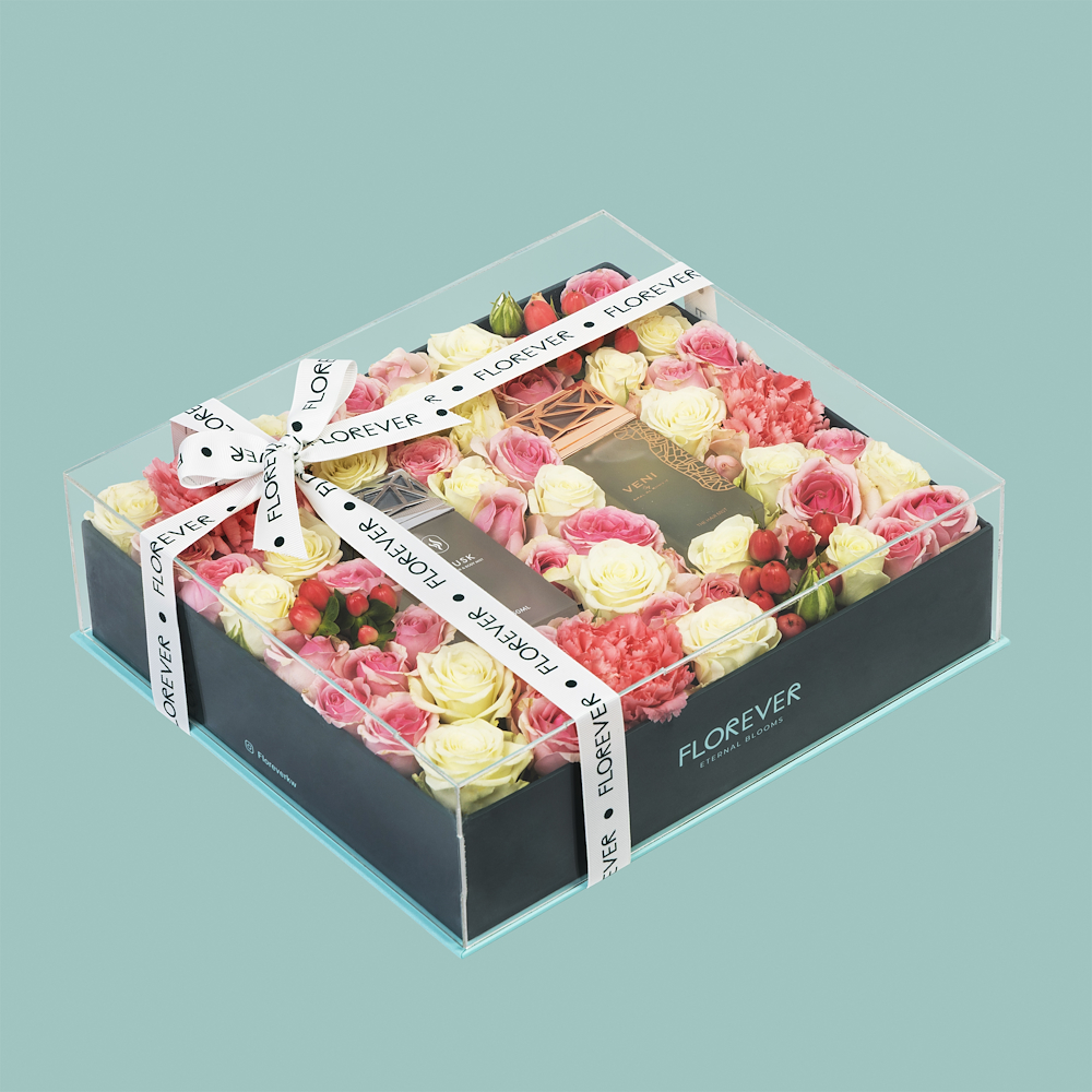 Love Tray roses, gerbera and carnation flowers with No Gravity perfume by Amal Al Kuwait.