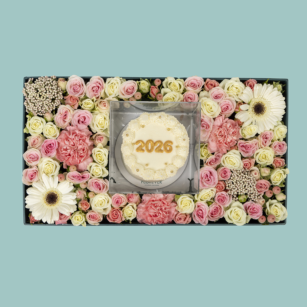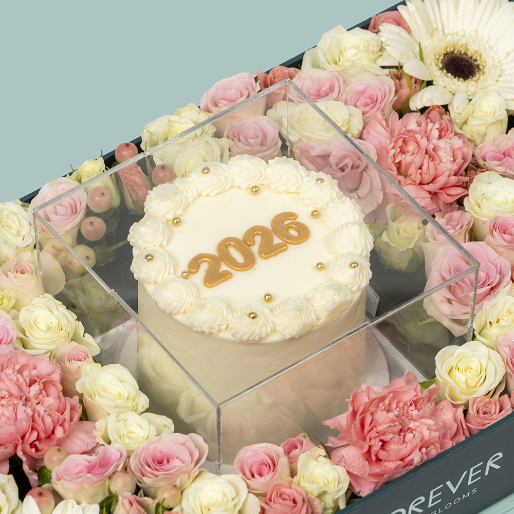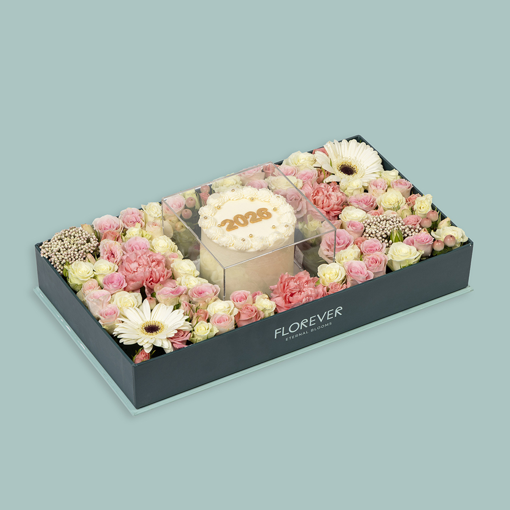 A premium 2026 cake presented in a luxurious flower tray featuring roses, carnations, and gerberas in soft pink and white tones. Perfect for gifting, celebrations, and New Year surprises. Beautifully packaged, ready to impress.