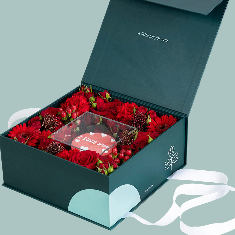An elegant box filled with red roses, baby roses, carnations and gerbera flowers with a mini cake with English customization only.