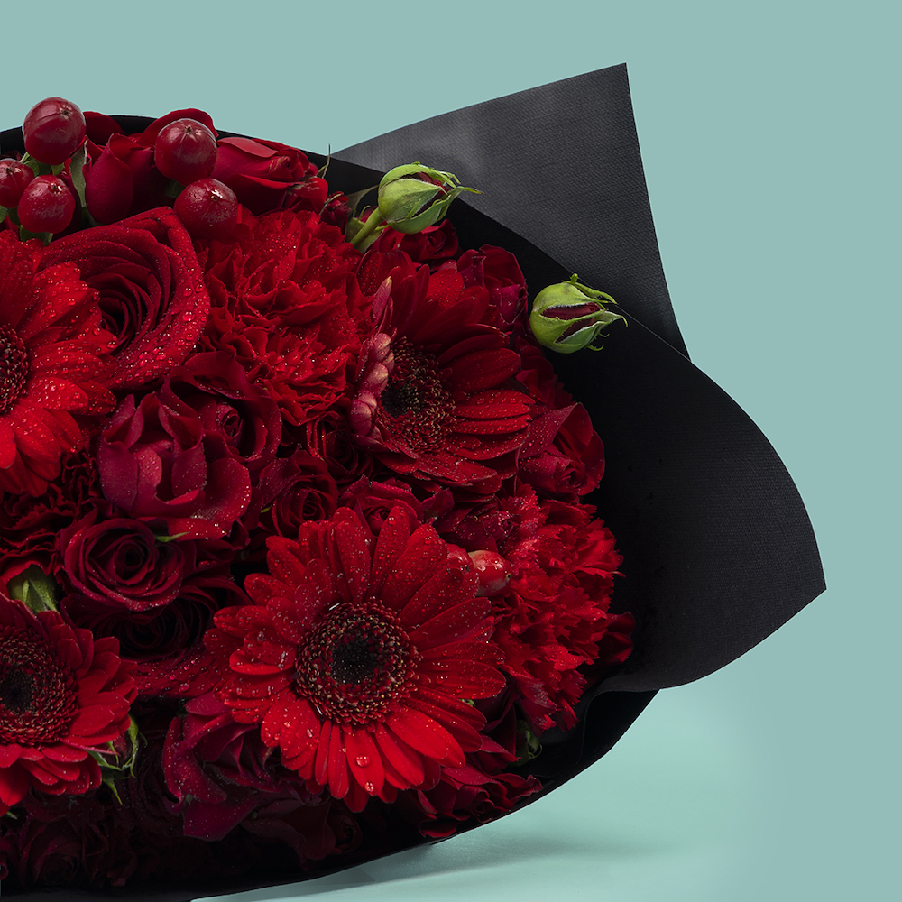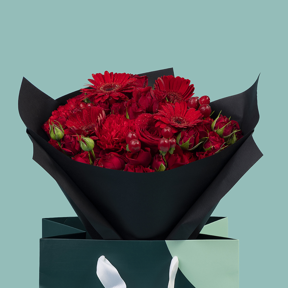 A fabulous mix of red flowers that contains a combination of gerberas, baby roses, roses, carnation and hypericum. Perfect for heartfelt gestures or simply elevating a space with quiet luxury.