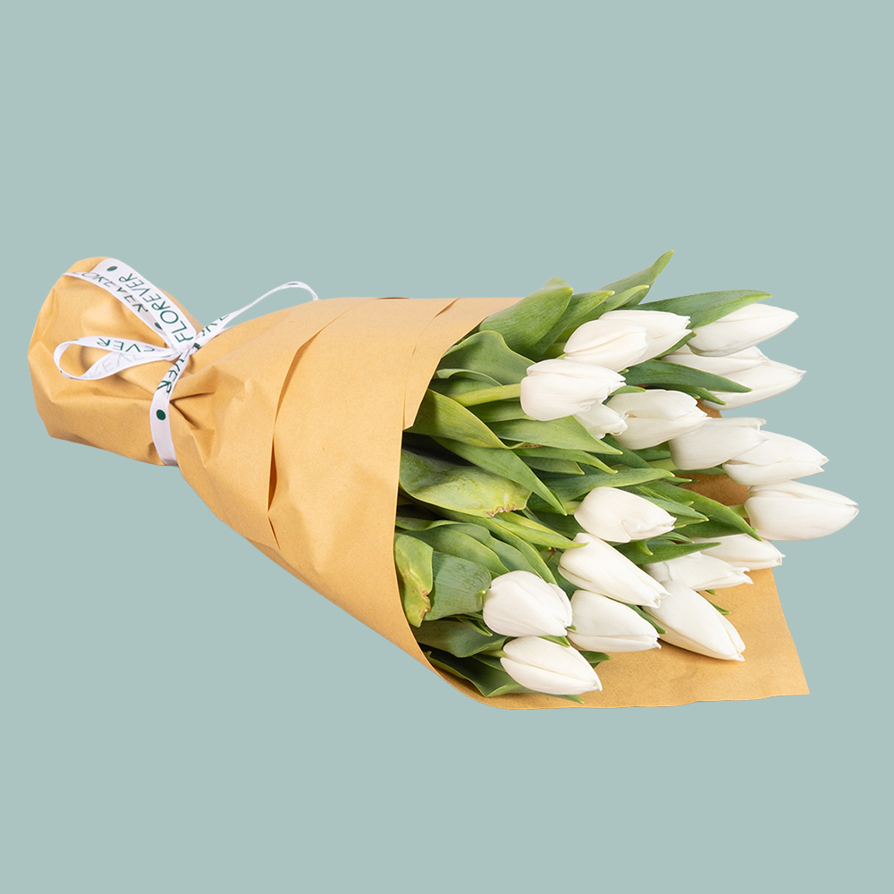 A hand bouquet arranged with 20 white tulip flowers.