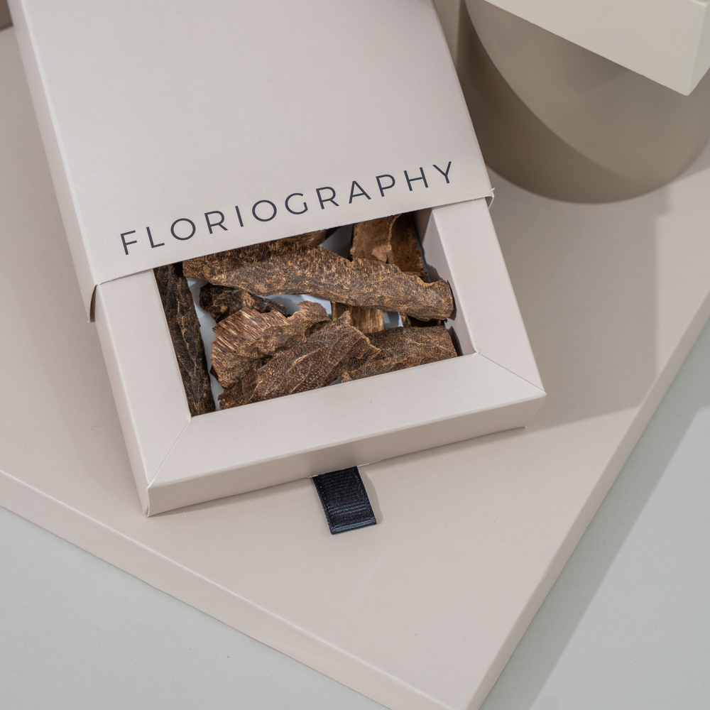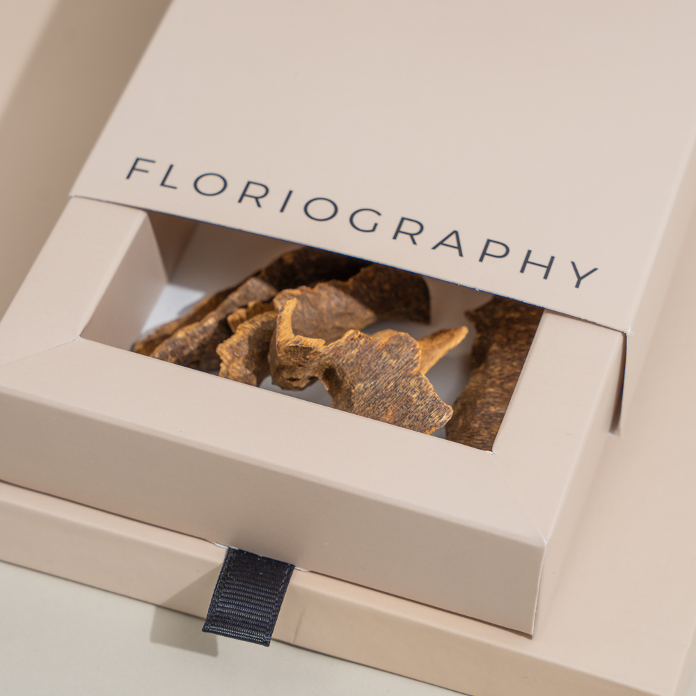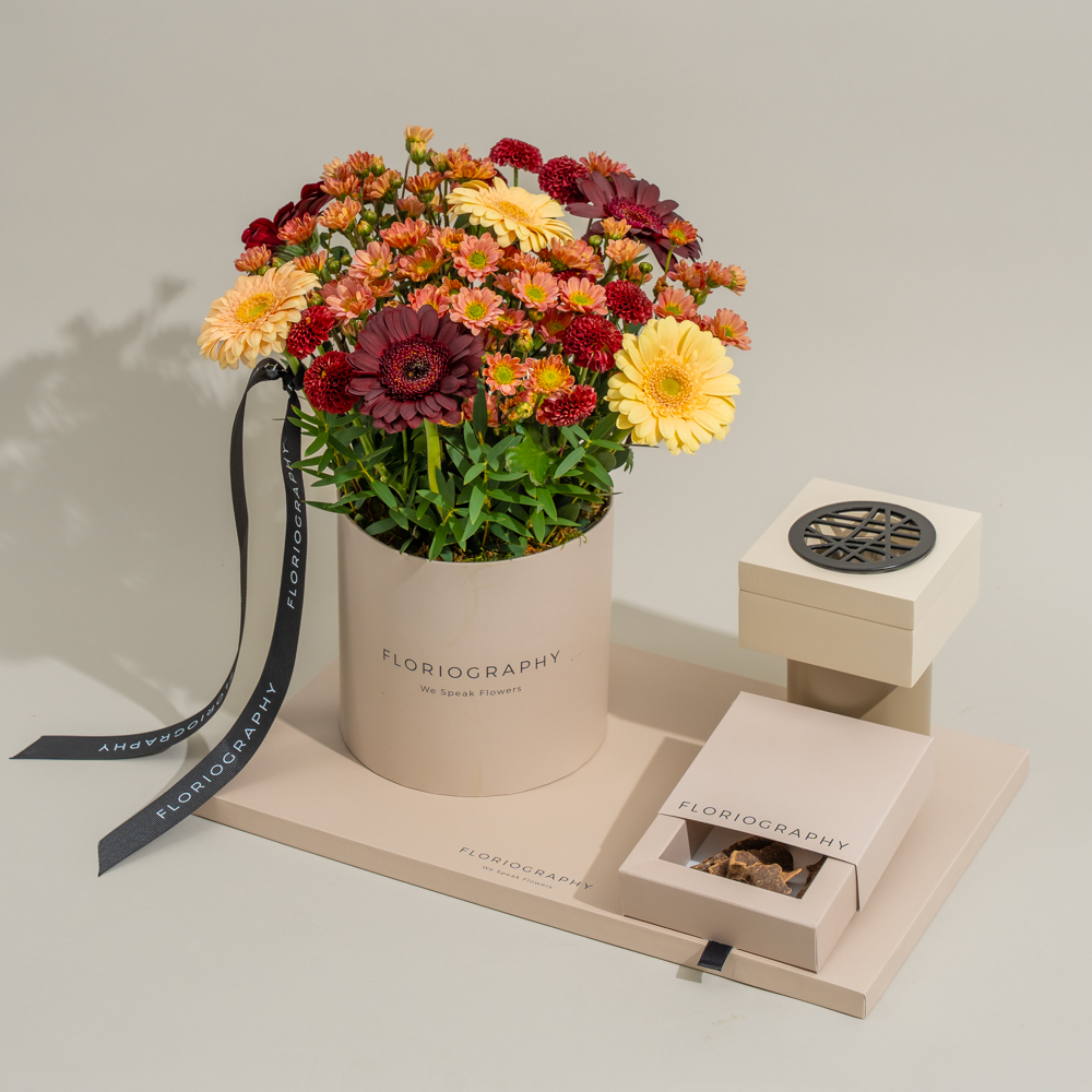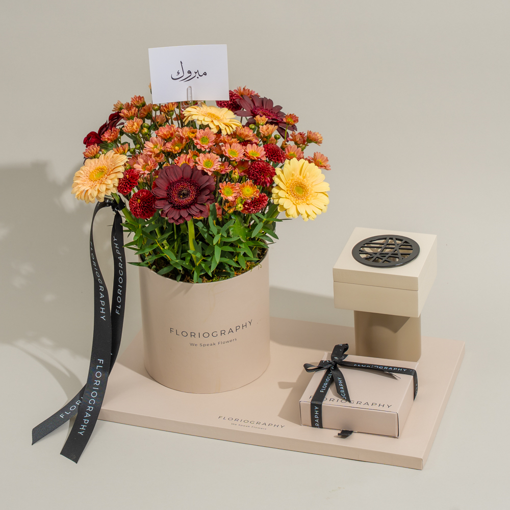 A special tray featuring a bouquet of maroon gerberas and chrysanthemum paired with an elegant mubkhar and 1 tola of trad super bokhour by Zawaya.