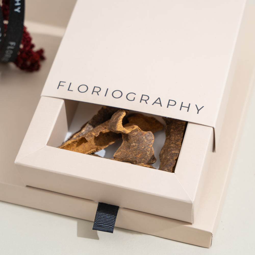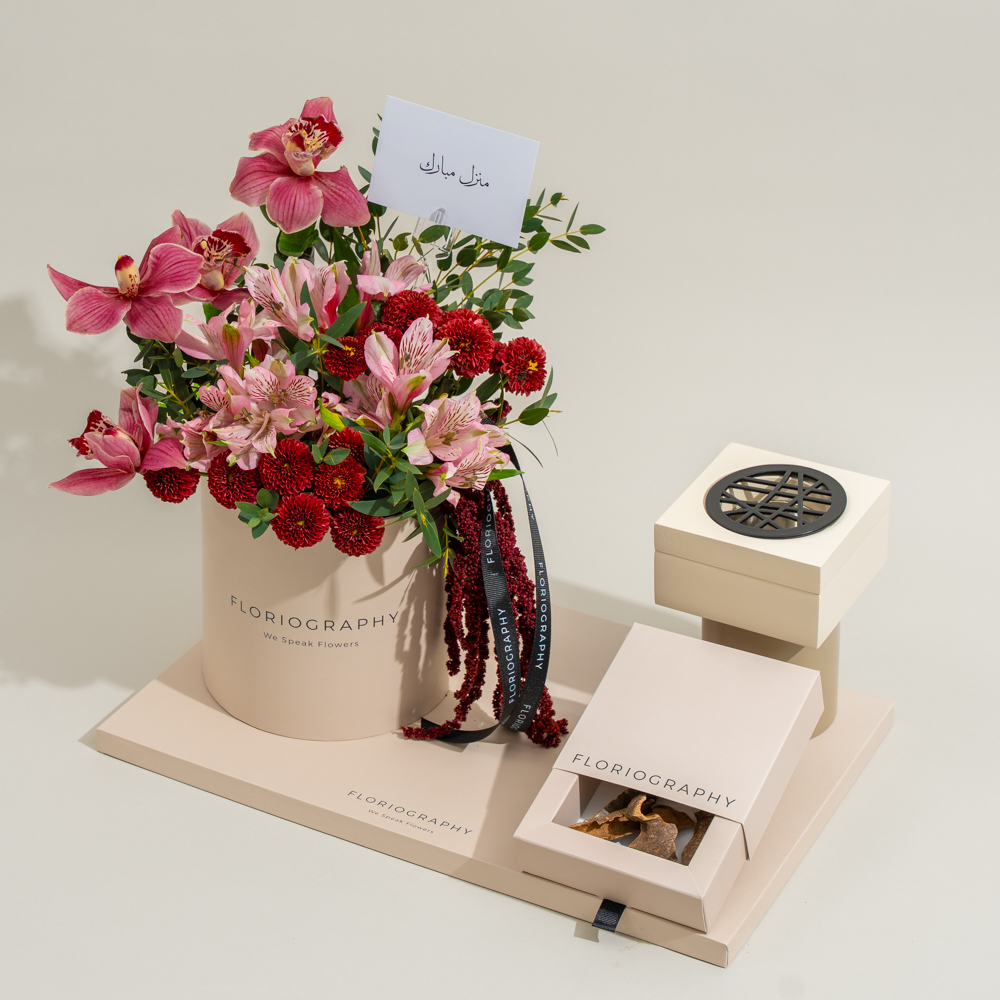 A special tray featuring a flower bouquet of cymbidiums, alstroemerias and chrysanthemums paired with an elegant mubkhar and 1 tola of bokhour (trad super zawaya).
