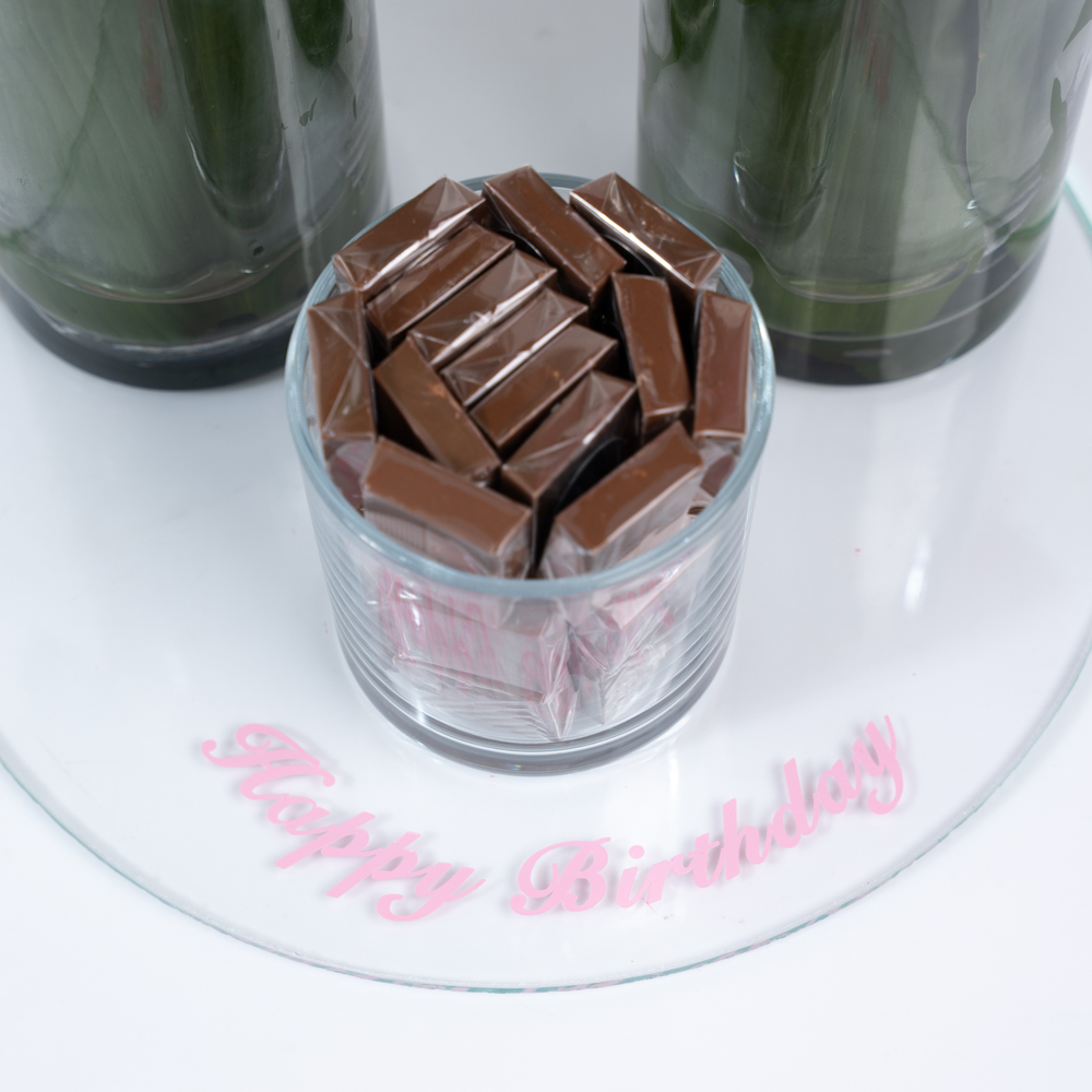 A glass tray that includes a vase of baby roses, a vase of hydrangea, and a jar of chocolate.