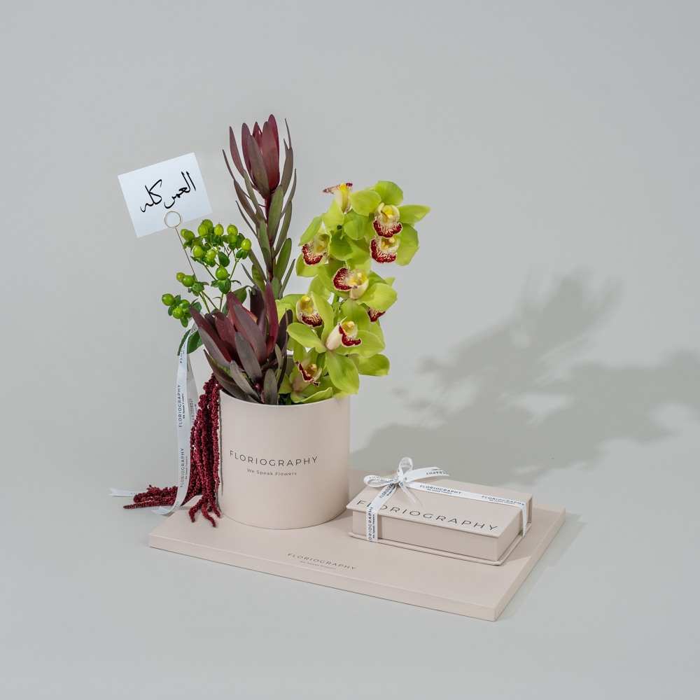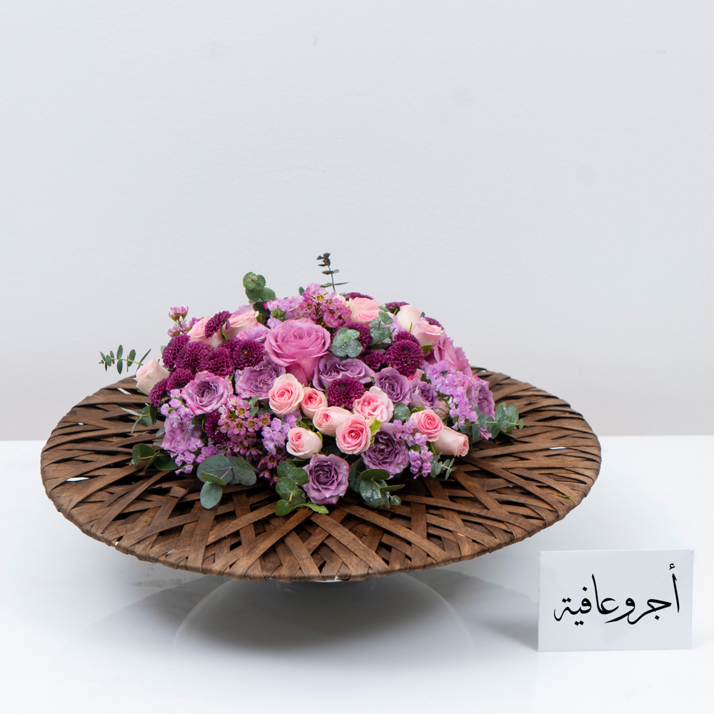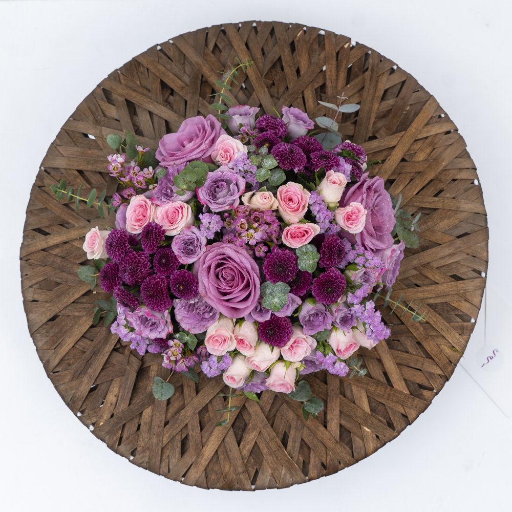 A bouquet of baby roses, statice, chrysanthemums, wax, and leaves.