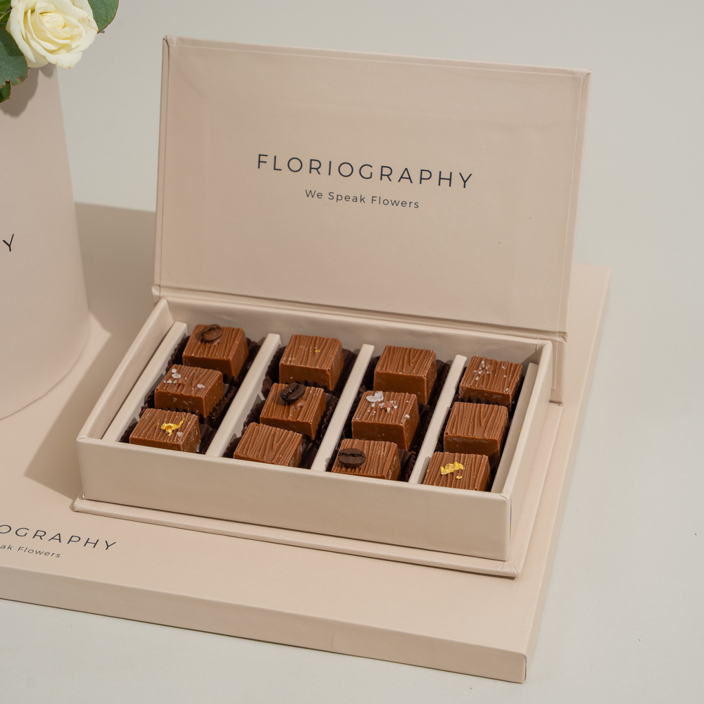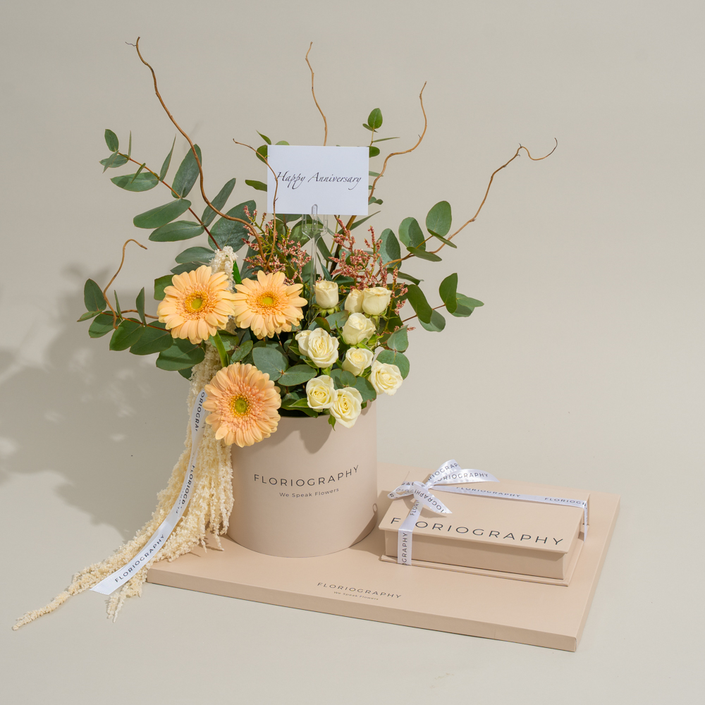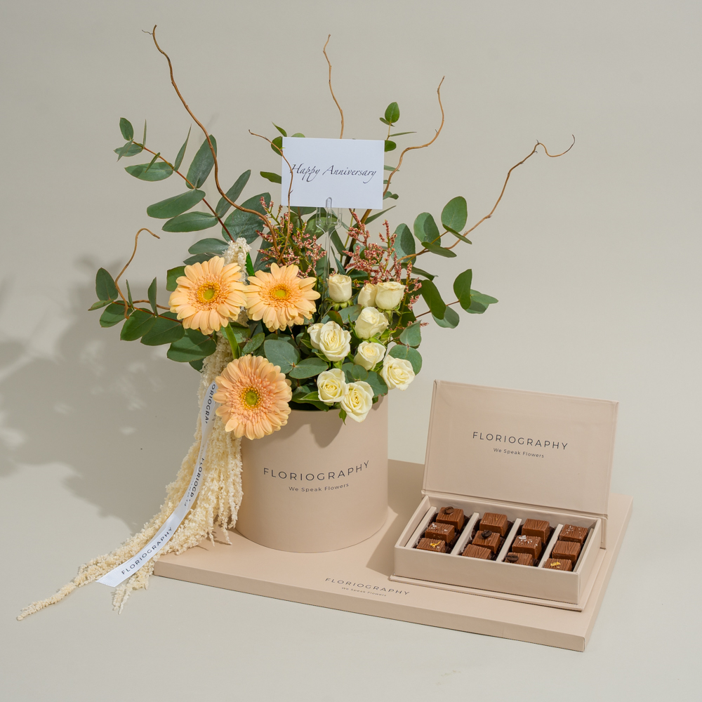 A special tray featuring a bouquet of fresh peach gerberas, white baby roses, and eucalyptus leaves, paired with a box of assorted chocolates.