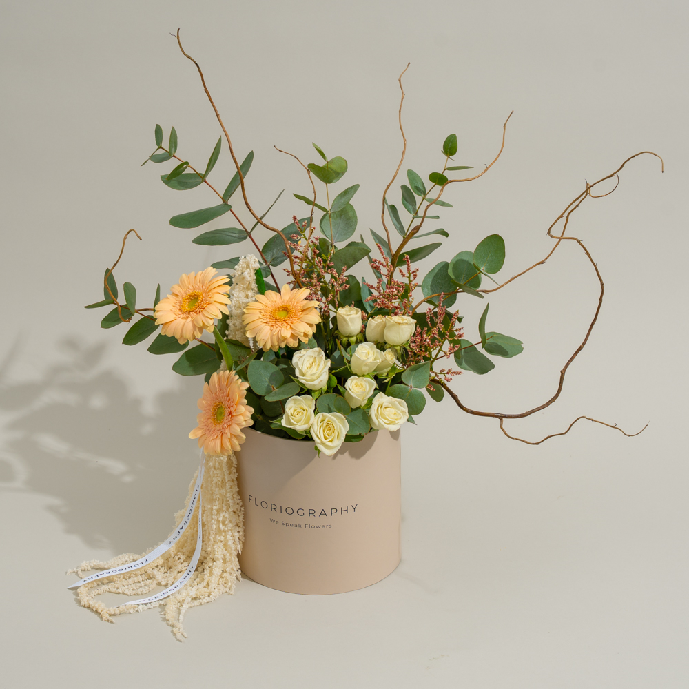 A beautiful bouquet featuring gerberas, baby roses, eucalyptus and salix sticks.