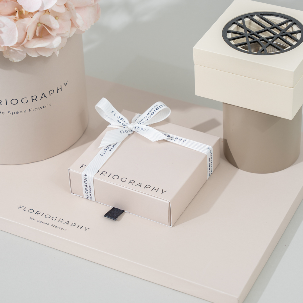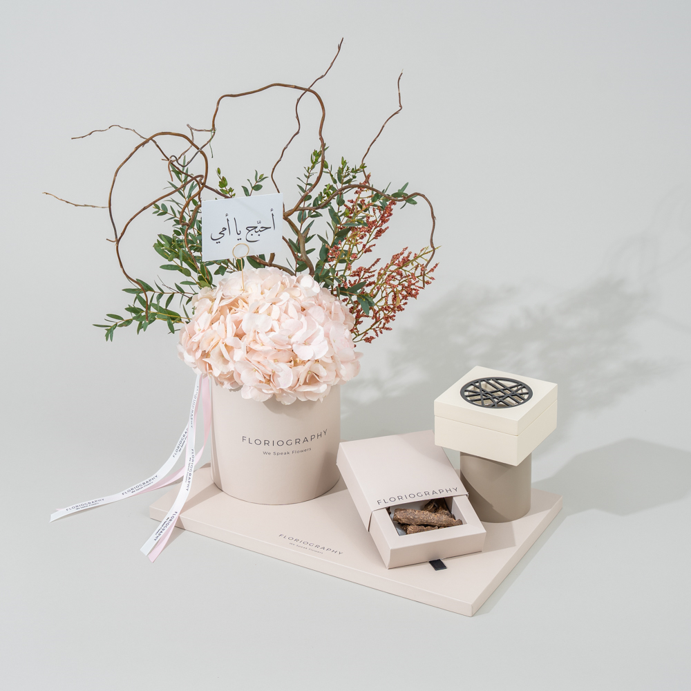 A special tray featuring a fresh hydrangea bouquet, paired with our unique burner and one tola of Trad Zawaya super.