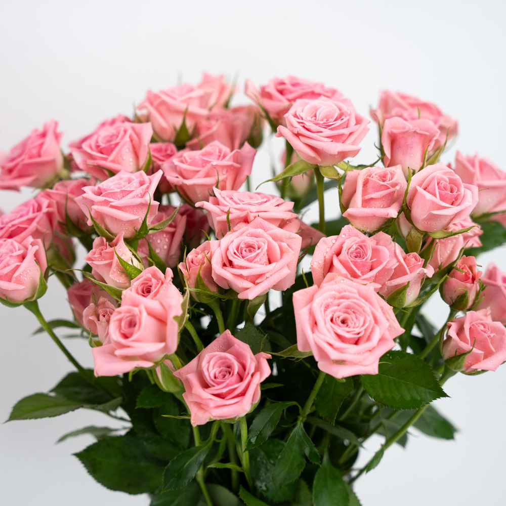 A floral arrangement that contains roses and baby roses along with chocolates.