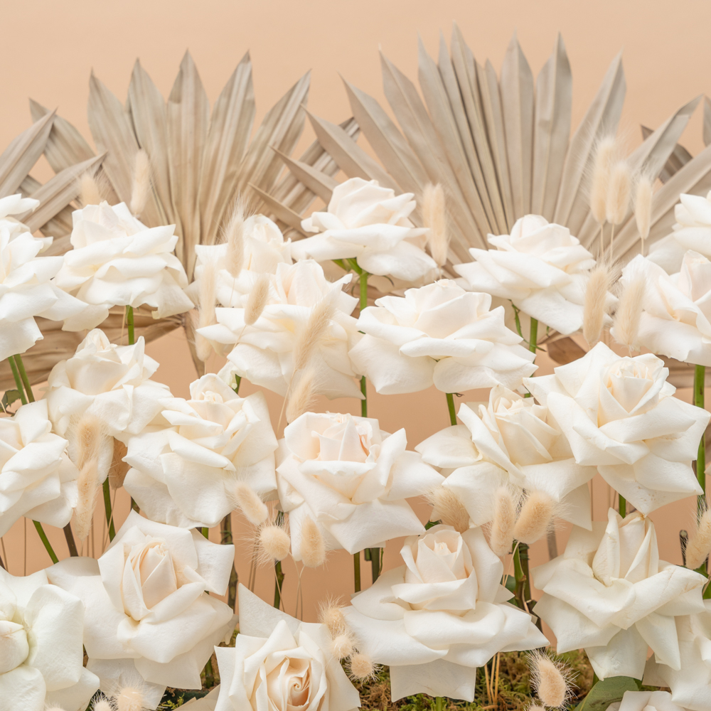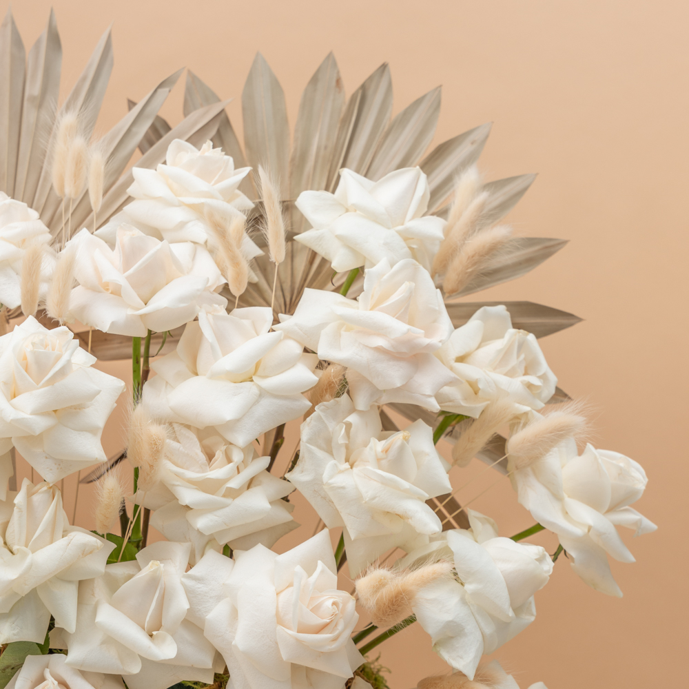 A customized classic tray filled with roses, lagurus and brown leaves.