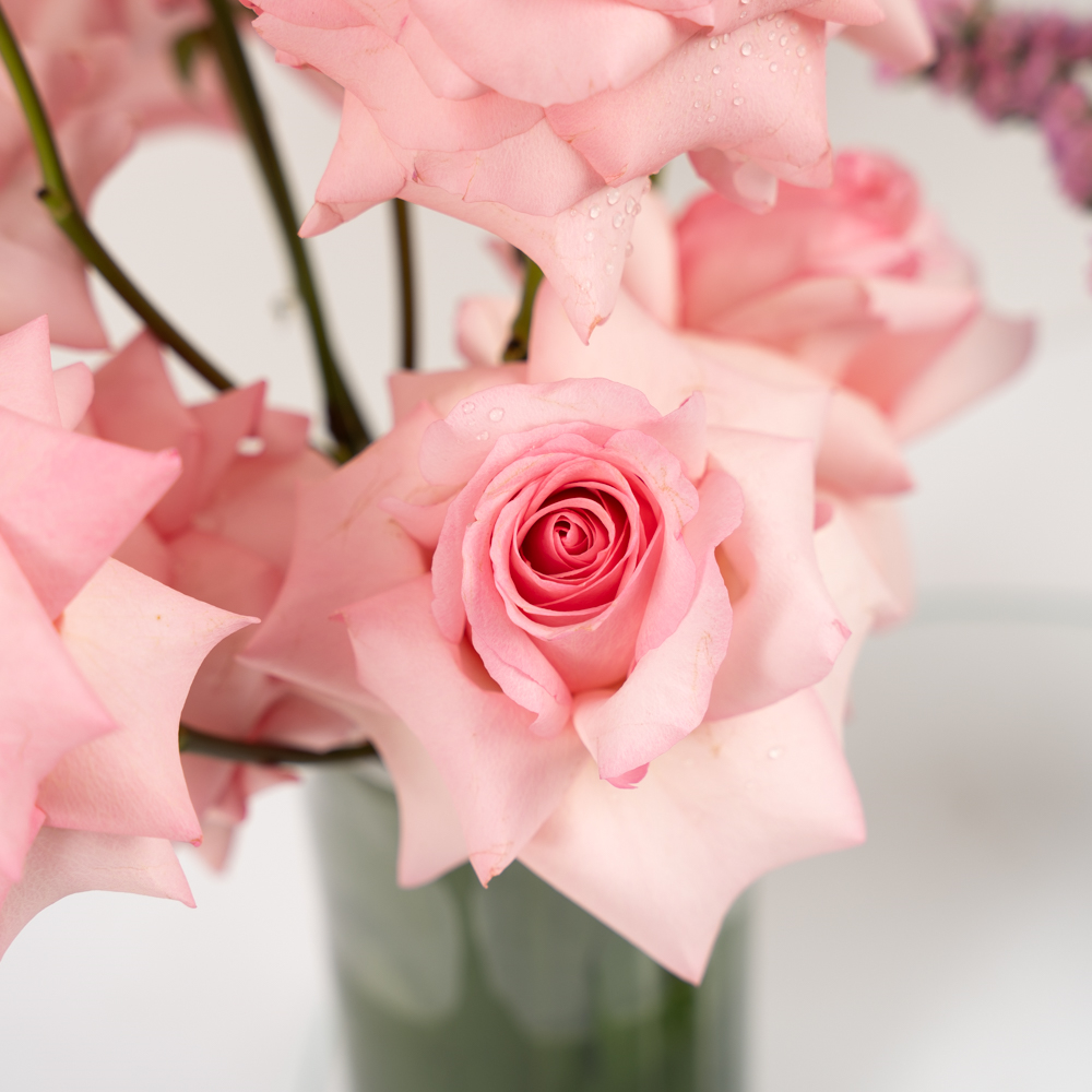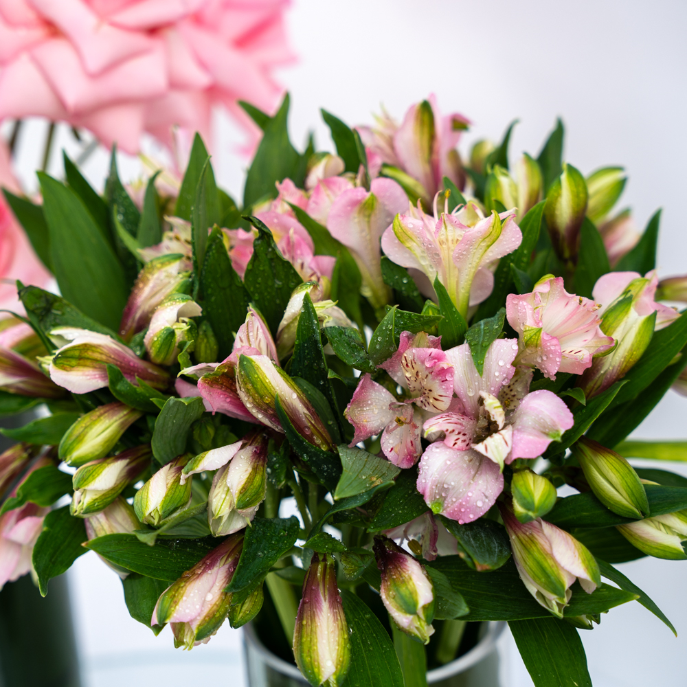 A bouquet containing 2 vases of pink roses and alstroemerias, with a jar of chocolates, arranged beautifully in a glass tray.