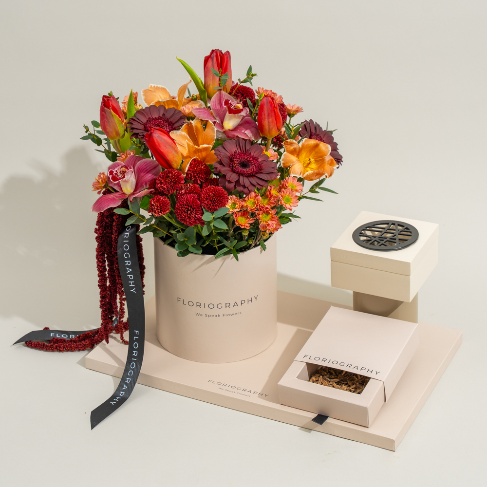 A special tray featuring a bouquet of peach, maroon and pink mix of gerbera, tuplis, cymbidium, chrysathemum paired with our special burner and one tola of bukhoor (Kissar).