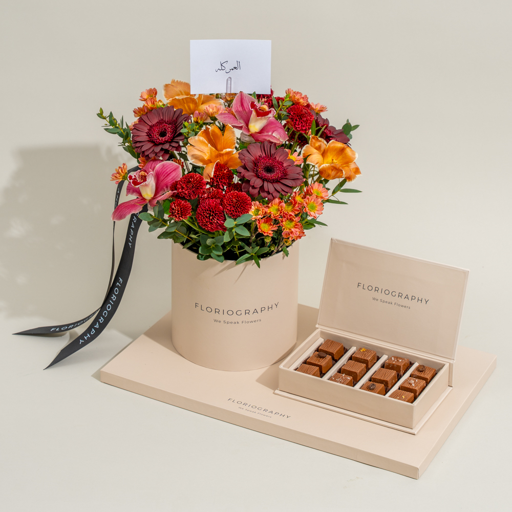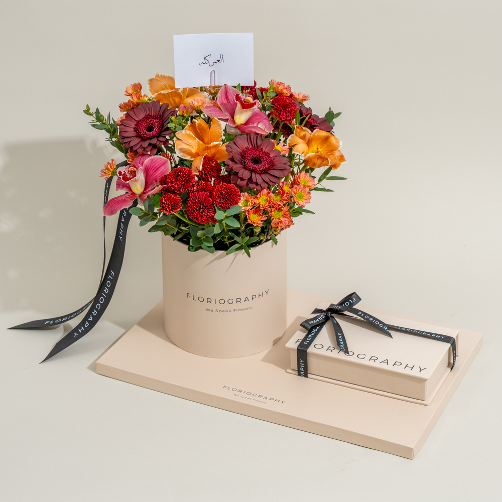 A special tray featuring a bouquet of maroon tulips, gerberas, cymbidiums and chrysanthemums paired with a box of assorted chocolate.