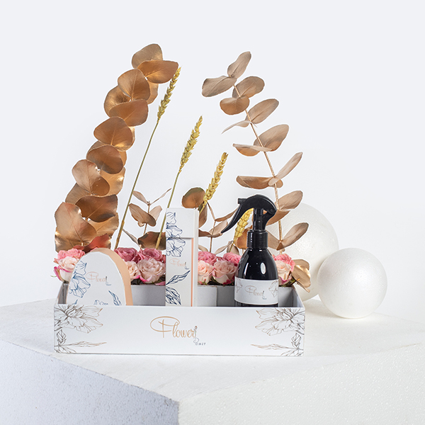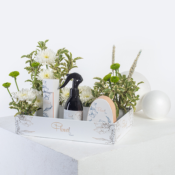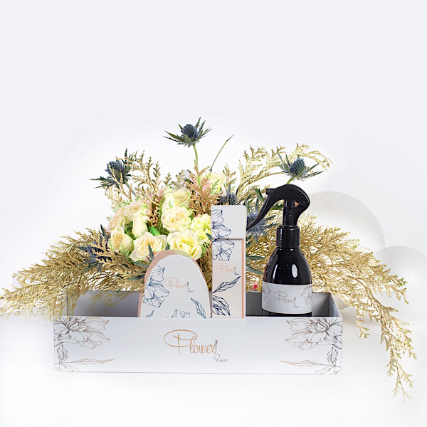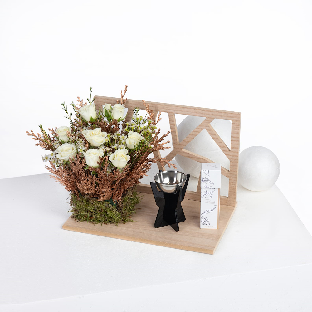 A wooden tray contains white baby roses and conifer with mubkhar and a perfume.