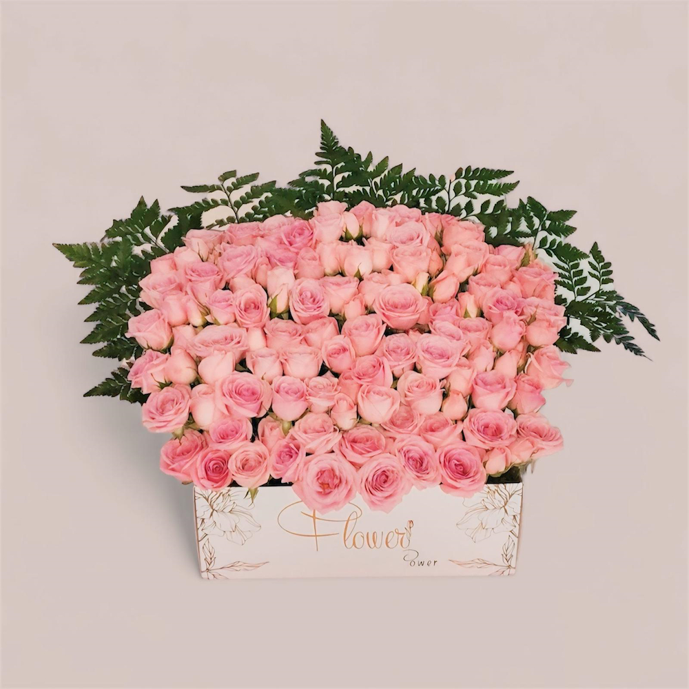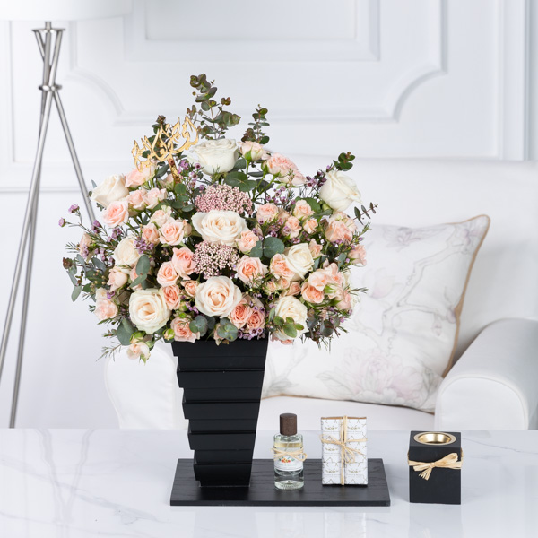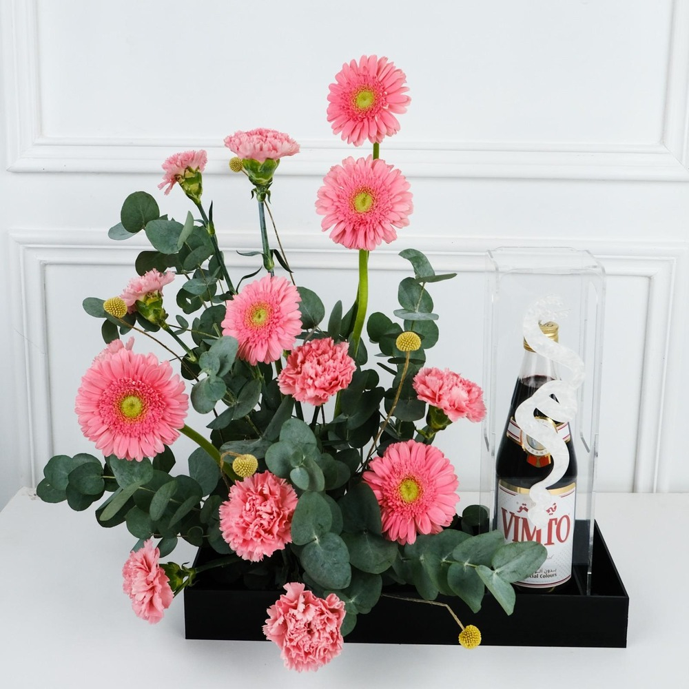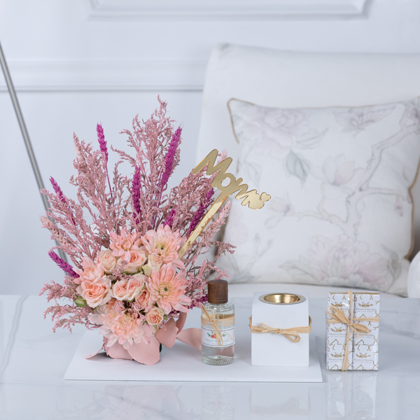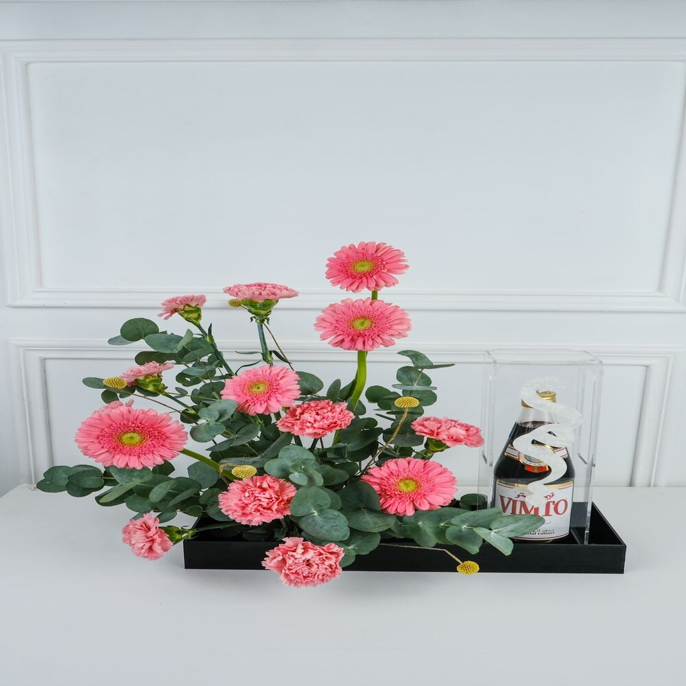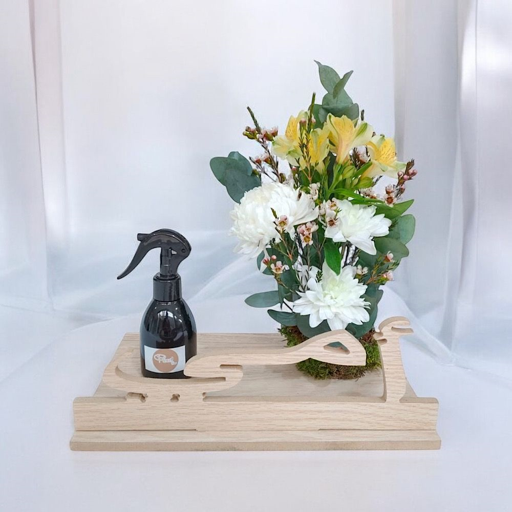 A wooden tray containing alstroemerias, wax flowers, and eucalyptus with a home spray.
