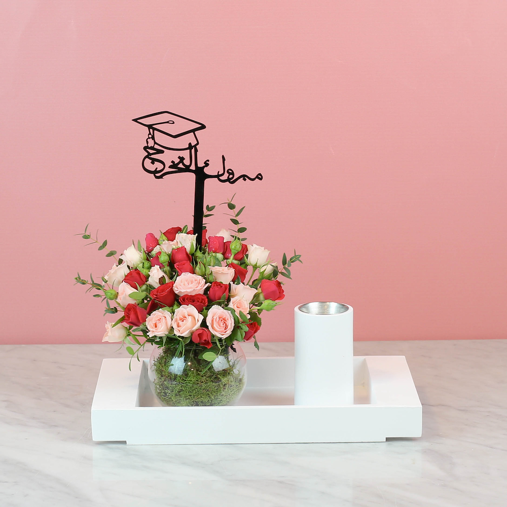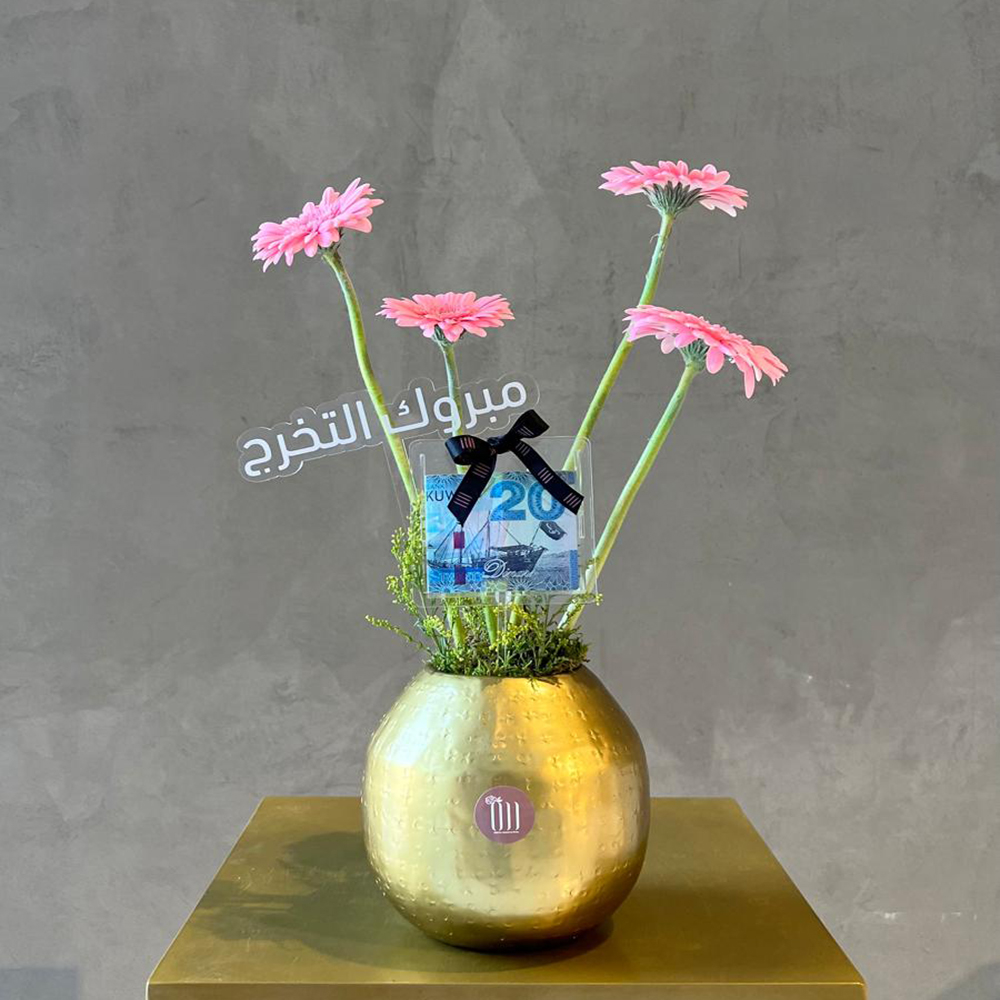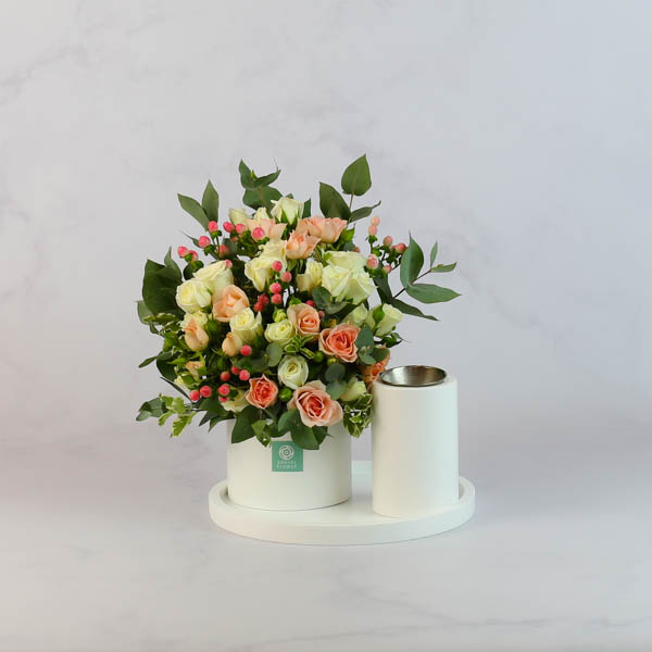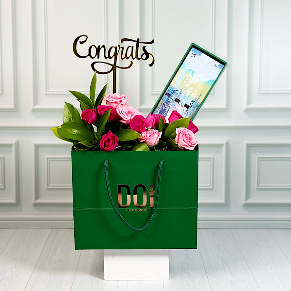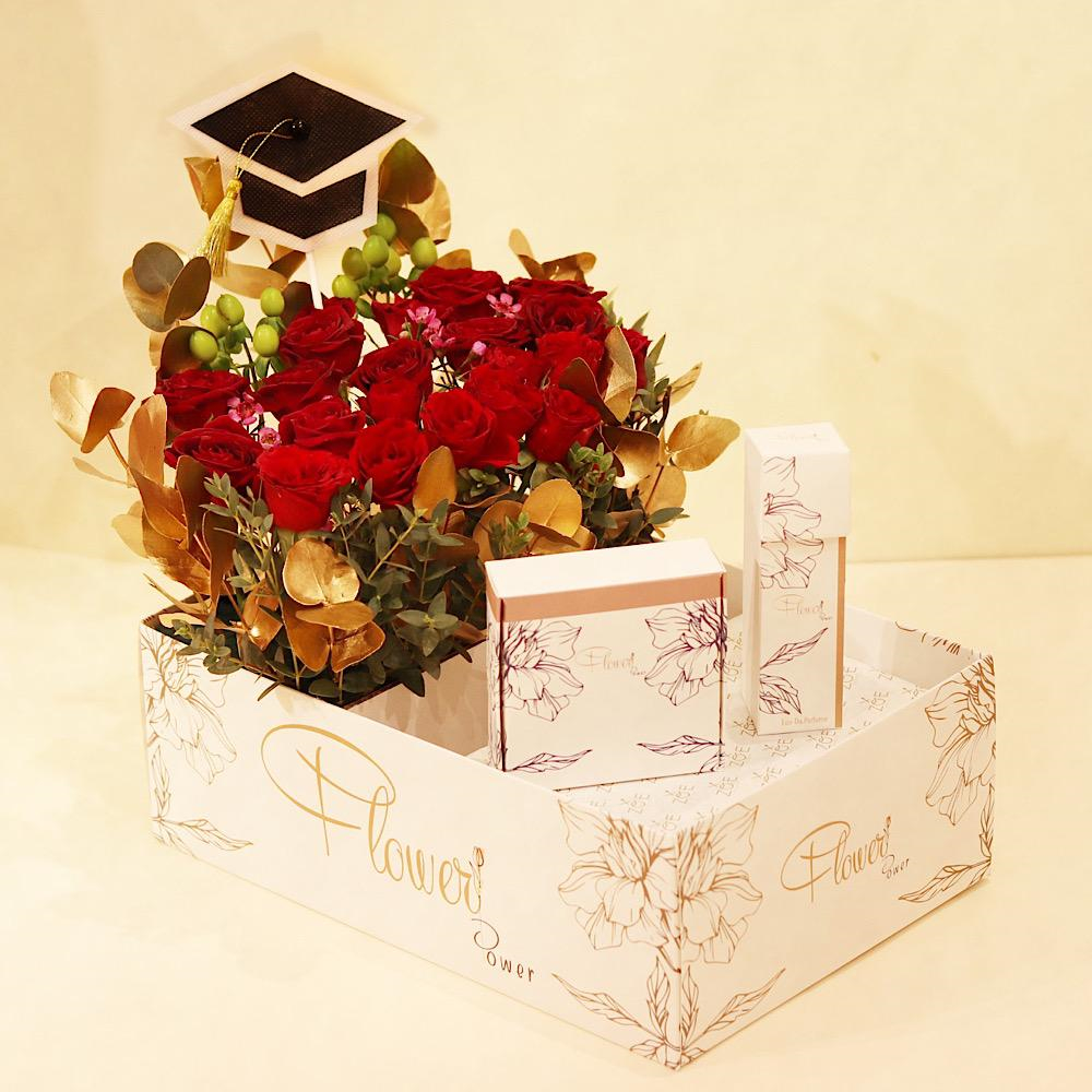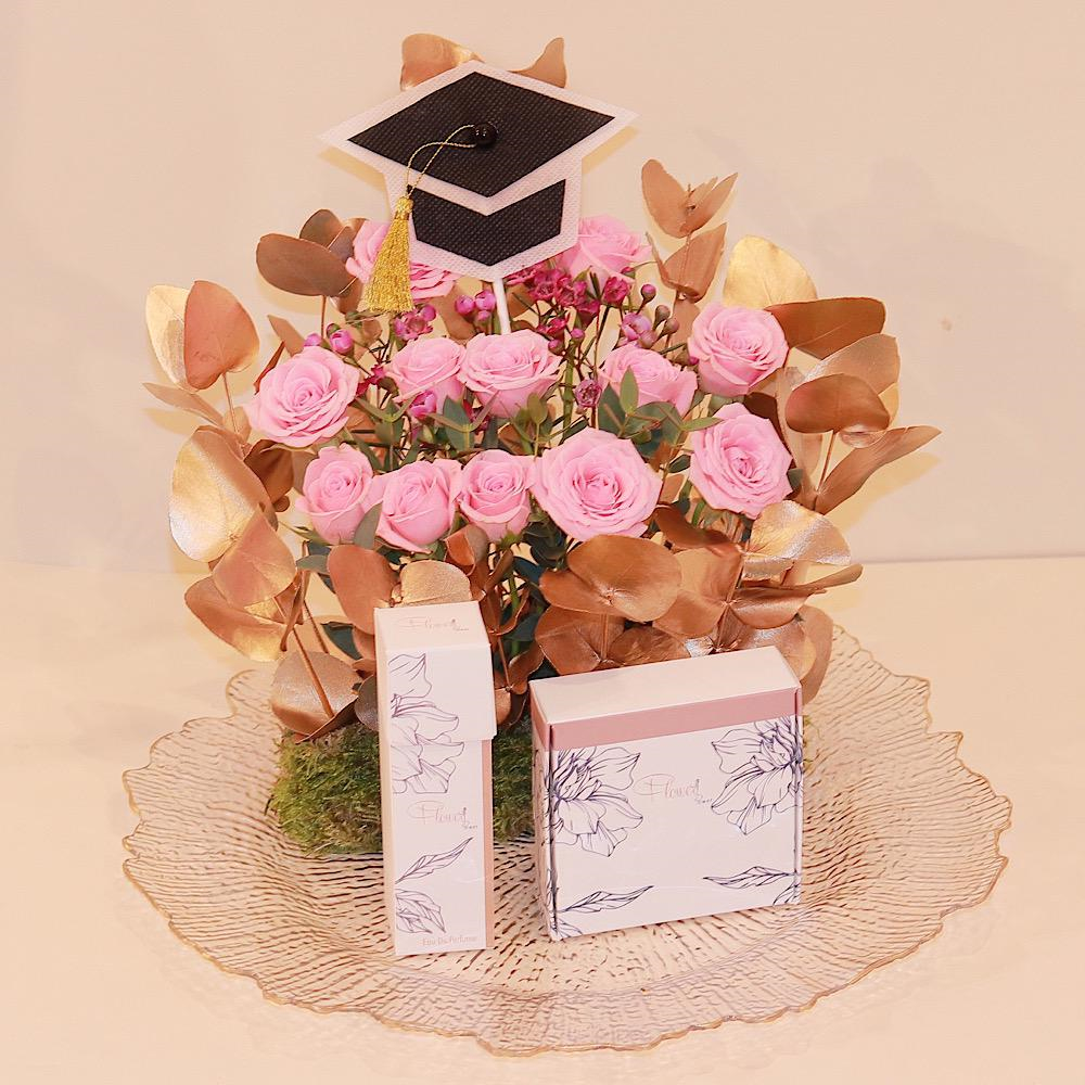 A bouquet containing pink baby roses and golden eucalyptus leaves with a box of Belgian chocolates and a perfume.