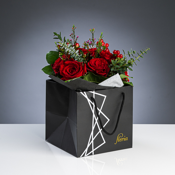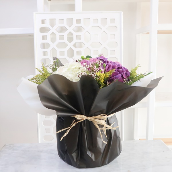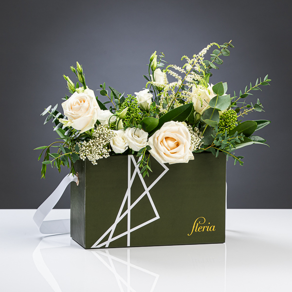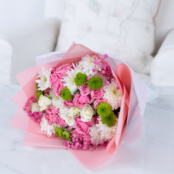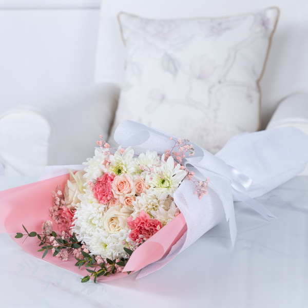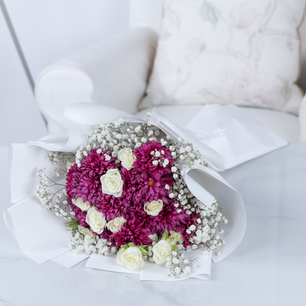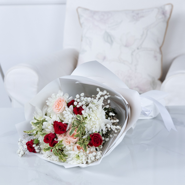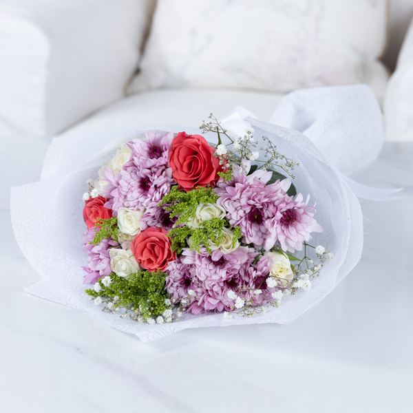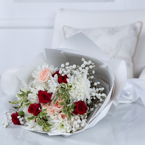 A hand bouquet contains baby roses, chrysanthemum, green leaves and gypsophilia Height: 50 cm, Width: 30 cm.