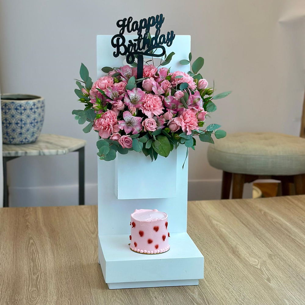 A bouquet arranged with roses, carnations, and alstroemerias with a cake.