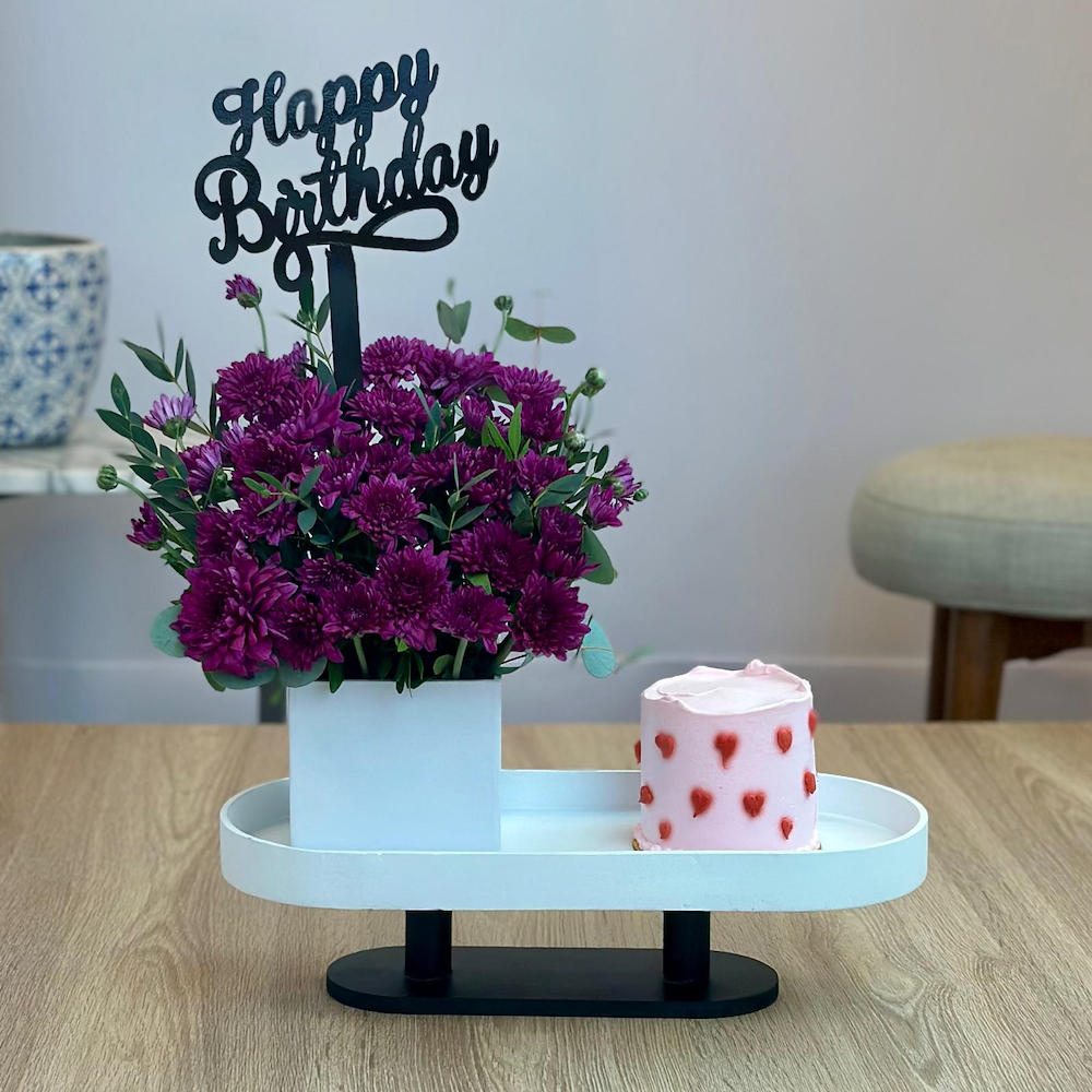 A bouquet containing purple chrysanthemums with a cake, arranged beautifully in a tray.