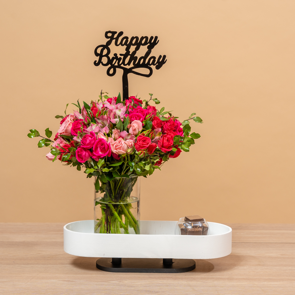 This bouquet contains red and pink roses, paired with delicious chocolates. A perfect gift to delight someone special.