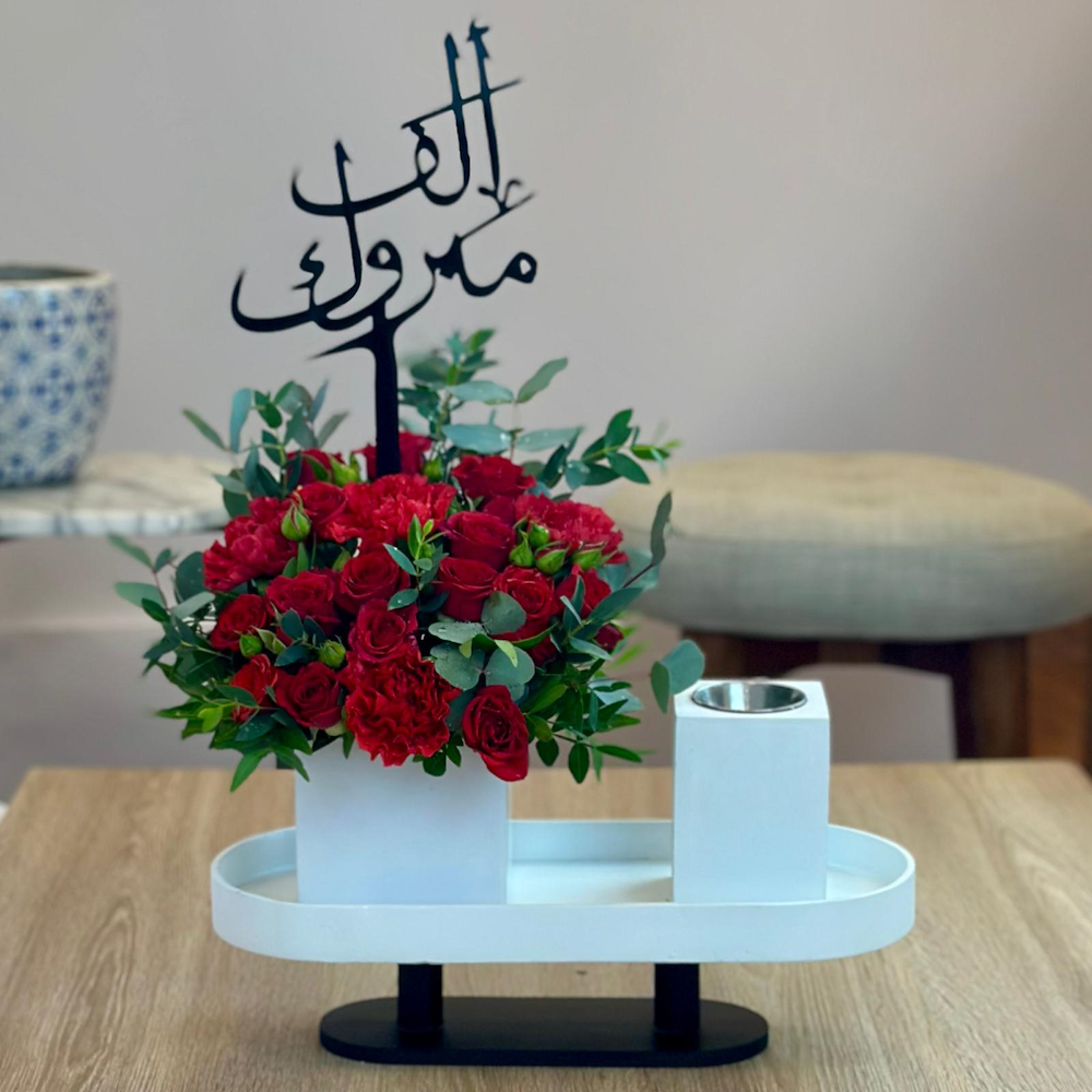 A bouquet filled with baby roses, and carnations with a mubkhar.