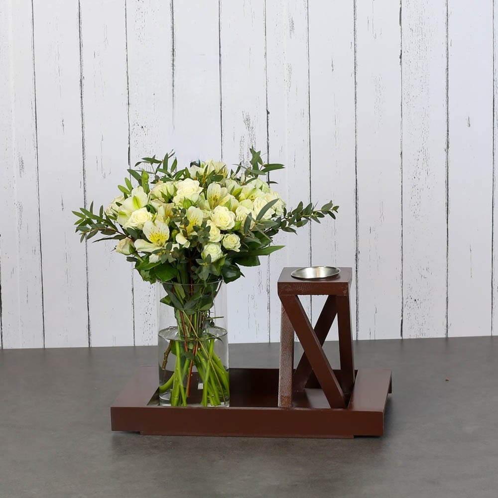 This bouquet contains baby roses and alstroemerias with an incense burner.