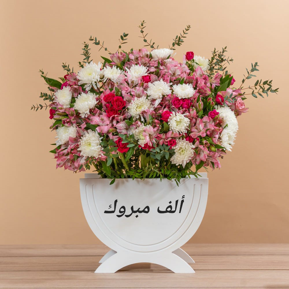 A bouquet that contains baby roses, chrysanthemums, and alstroemerias.